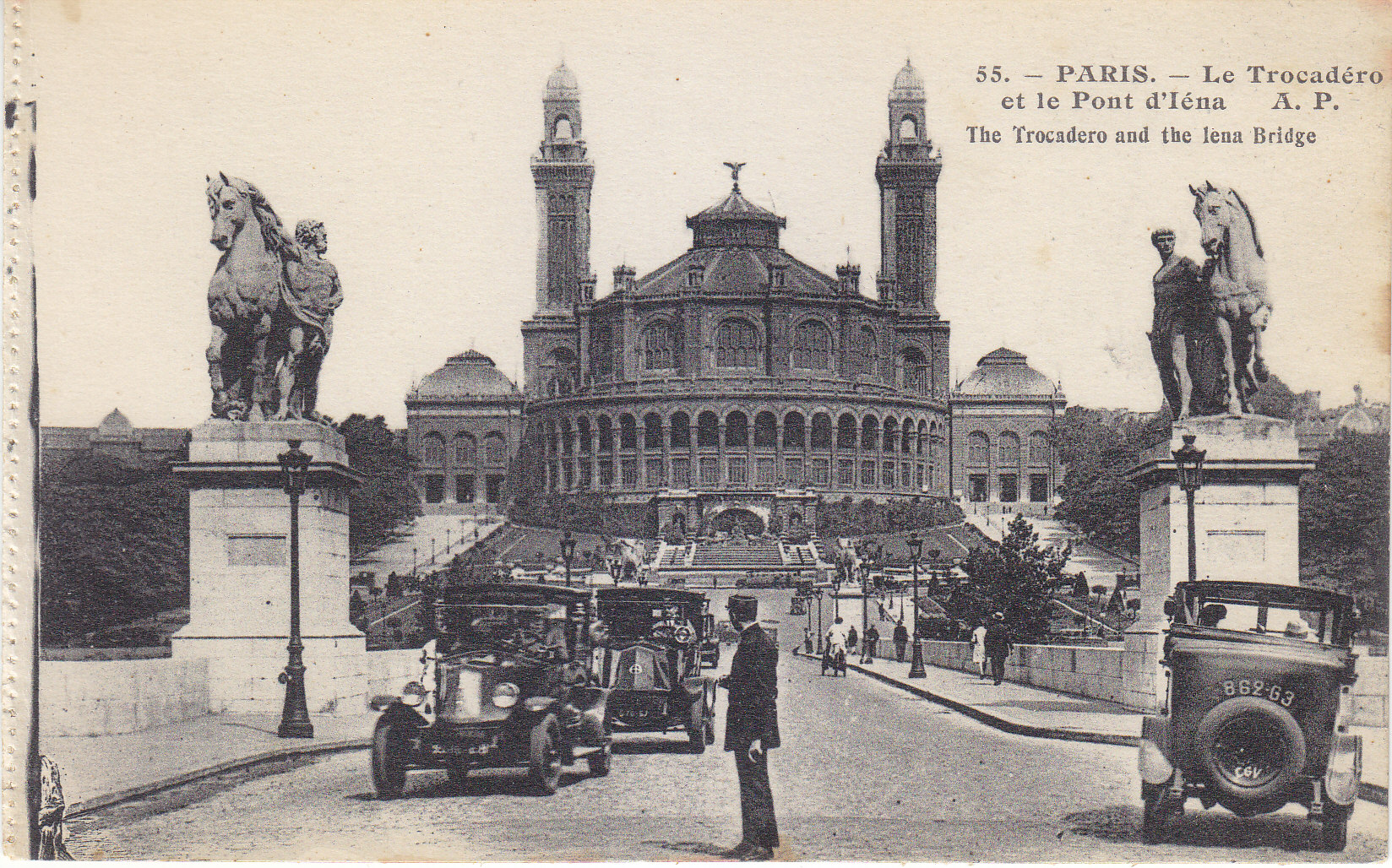POSTCARD #023 Le Trocadero et le Pont d'Iéna [The Trocadero and the Iena (Jena) Bridge, Paris, France]. 55. A.P. E. Papeghin, 24 Rue des Petites-Ecuries, Paris. 5.5" x 3.5" EXC