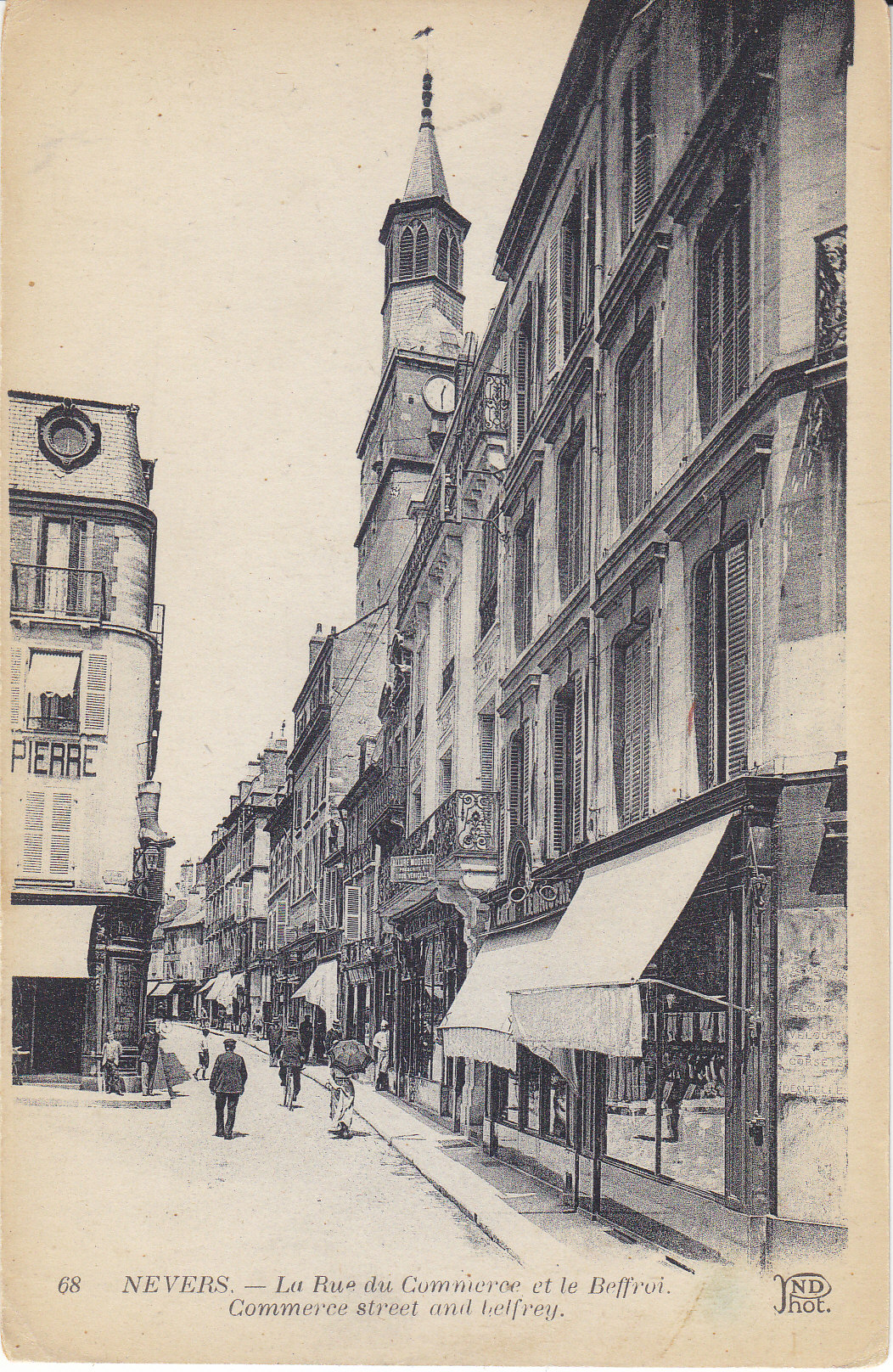 POSTCARD #025 La Rue du Commerce et le Beffroi [Commerce Street and Belfrey, Nevers, France]. 68. Ancien Estab. Neurdein et Cie. Imp. Crete, Succ, Corbeil, Paris, 52 Av. de Breteuil, Paris. 3.5" x 5.5" VG