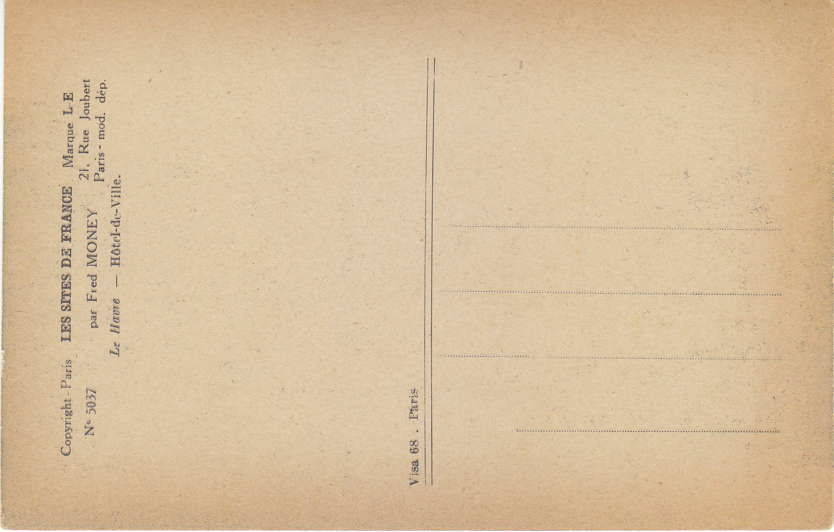 POSTCARD #031 Hotel-de-Ville, Le Havre [France]. Par Fred Money [artist]. Les Sites de France. Copyright Paris No. 5037. Marque L-E, 21 Rue Joubert, Paris, mod. dep. 5.5" x 3.5" EXC