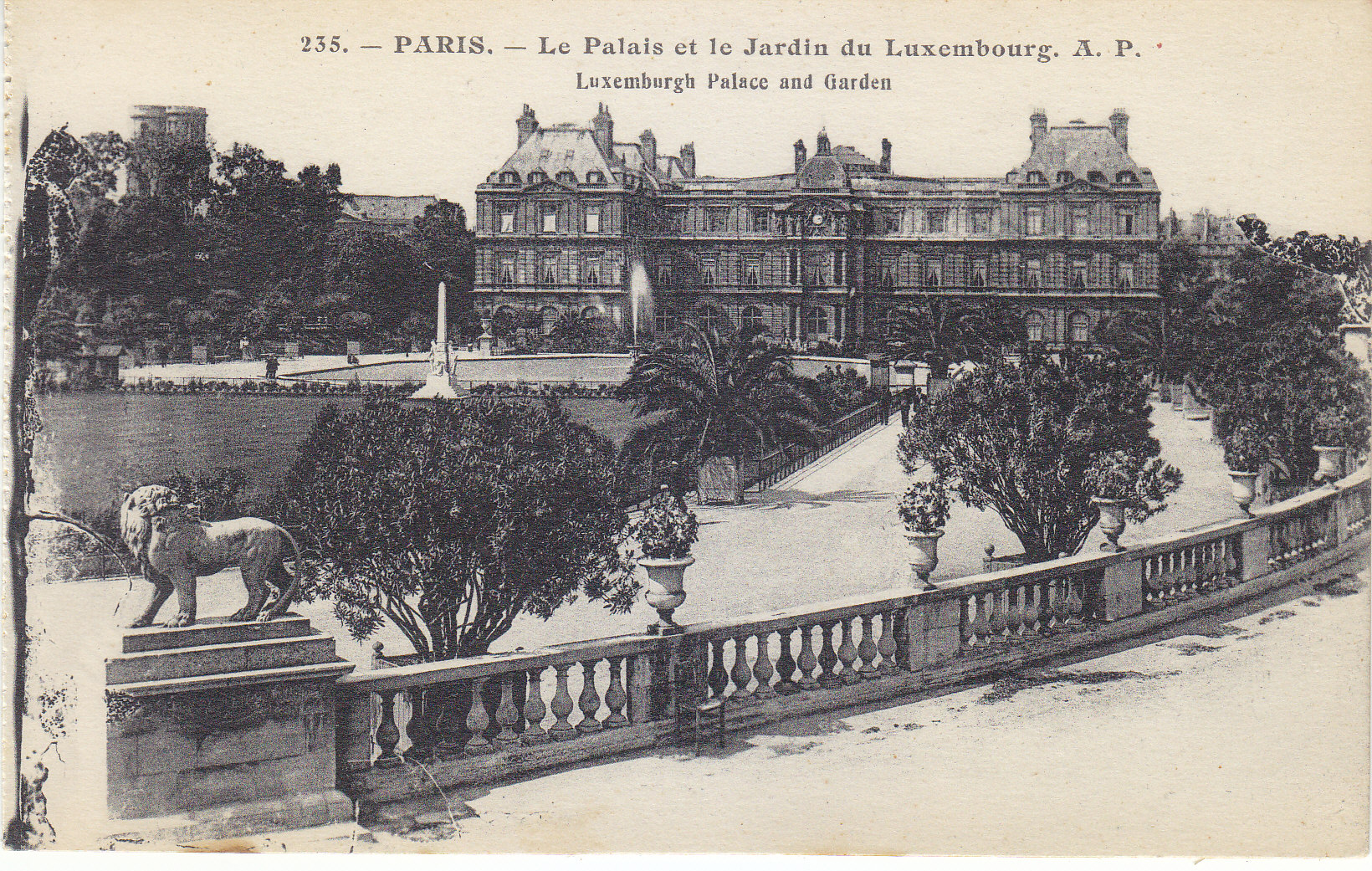 POSTCARD #039 Le Palais et le Jardin du Luxembourg. Luxembourg Palace and Garden, Paris, France]. 235. A.P. E. Papeghin, 24 Rue des Petites-Ecuries, Paris. Rough edge on left where it was torn out of a booklet. 5.5" x 3.5" EXC