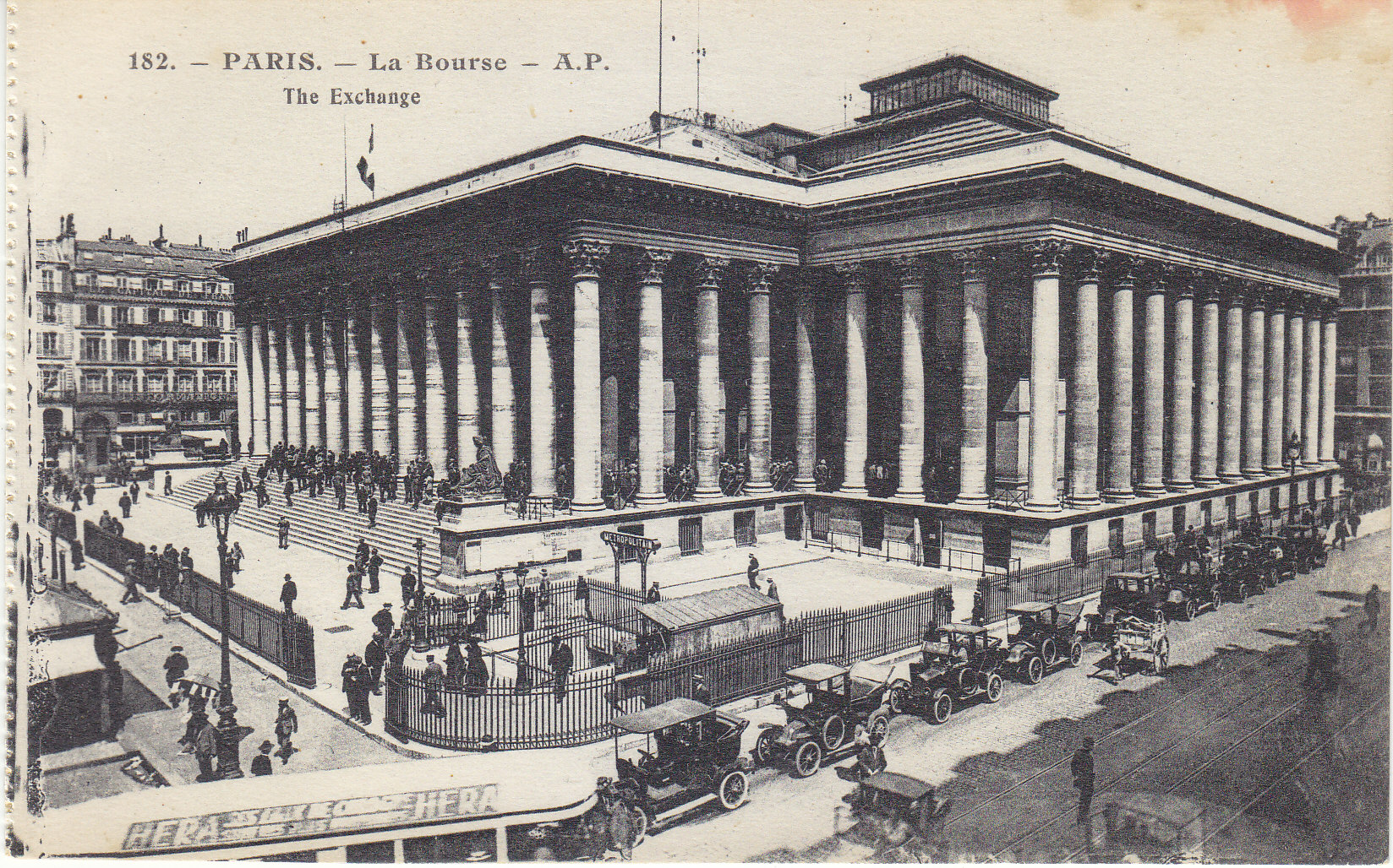 POSTCARD #041 La Bourse [The Exchange, Paris, France]. 182. A.P. E. Papeghin, 24 Rue des Petites-Ecuries, Paris. Rough edge on left where it was torn out of a booklet. 5.5" x 3.5" VG