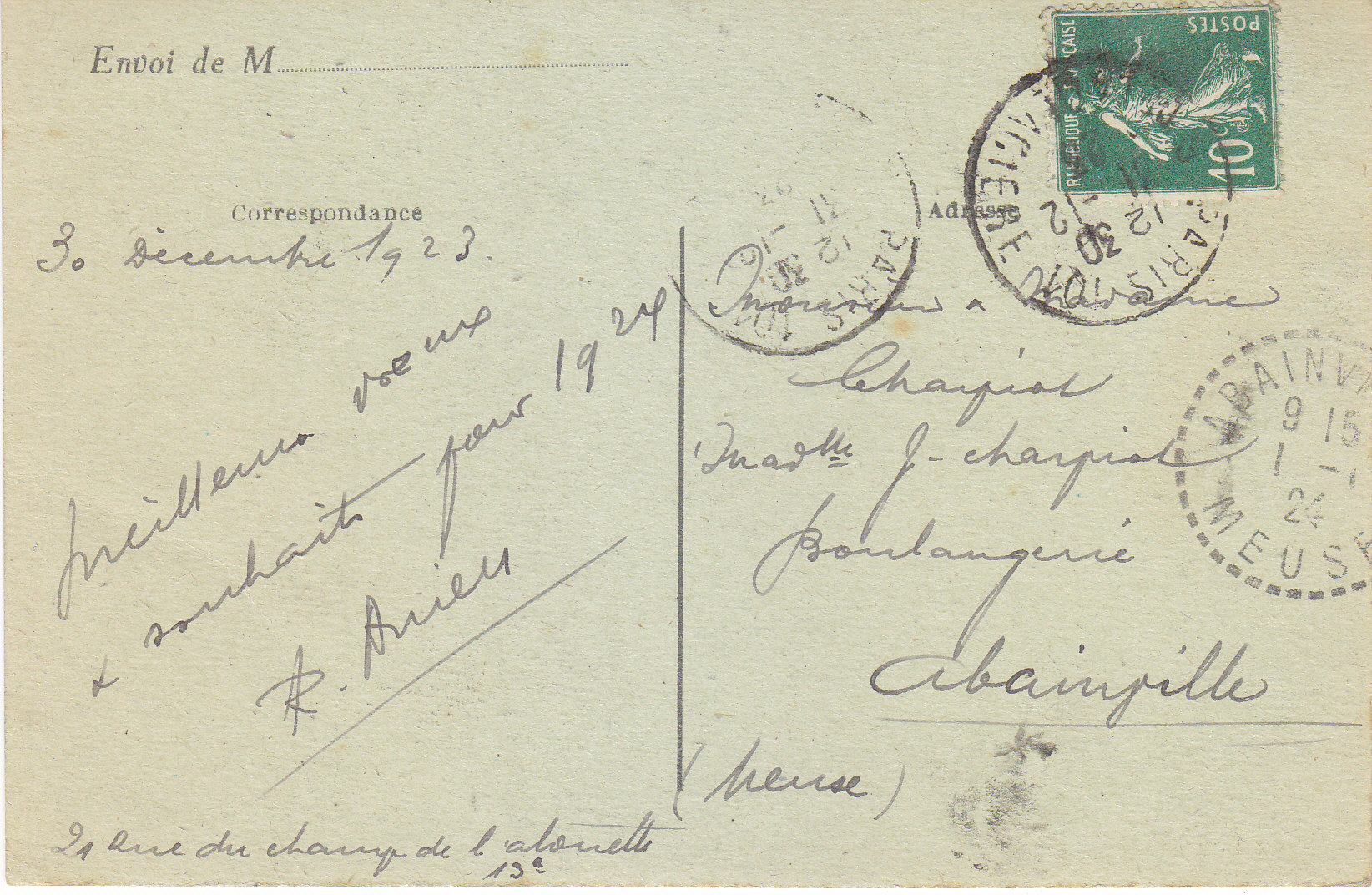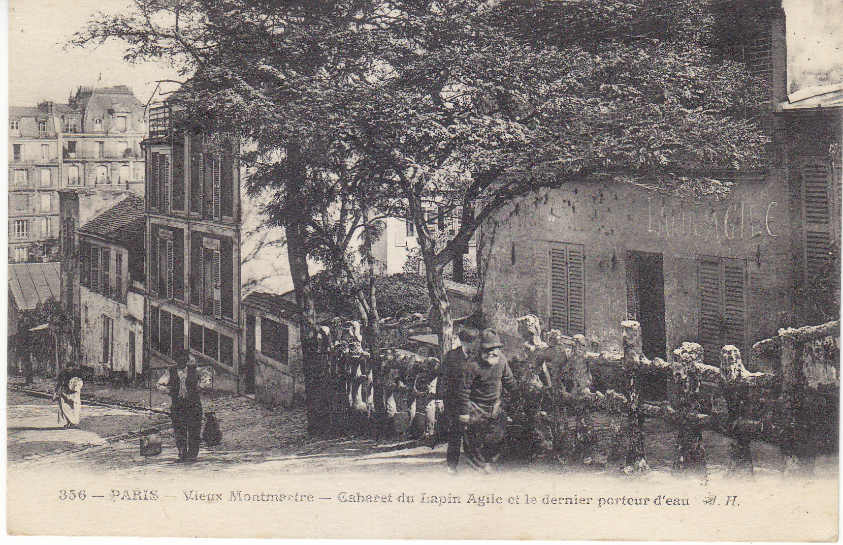 POSTCARD #045 Cabaret du Lapin Agile et le dernier porteur d'eau, Vieux Montmartre [Lapin Agile Cafe and the last water carrier, Old Montmartre, Paris, France]. 356. J.H. Message dated December 30, 1923. 5.5" x 3.5" EXC