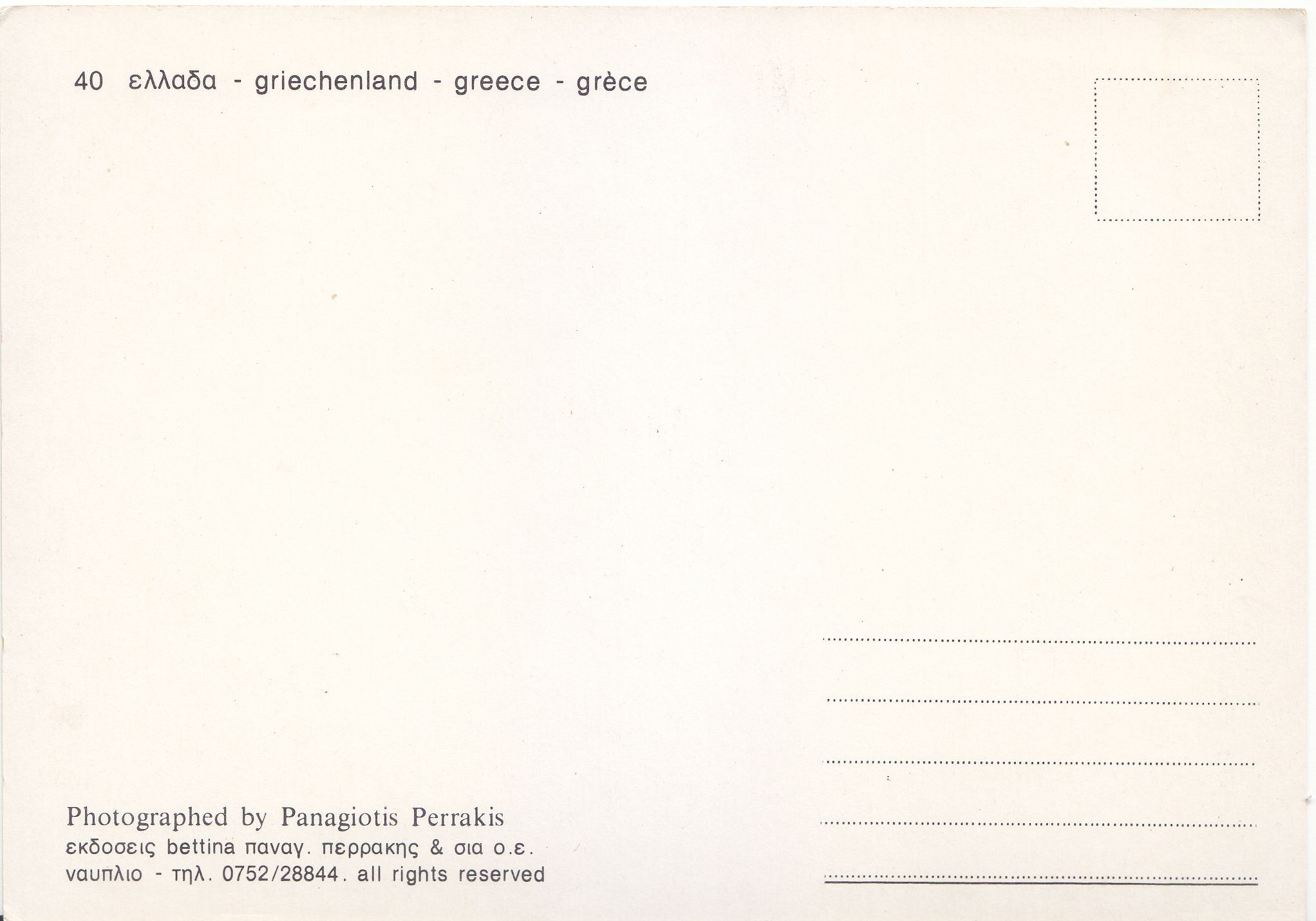 POSTCARD #080 Greece. [Also written in Greek, German, and another language; Address also in Greek.] Photographed by Panagiotis Perrakis. 40. All rights reserved. 4.75" x 6.5" EXC
