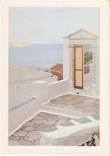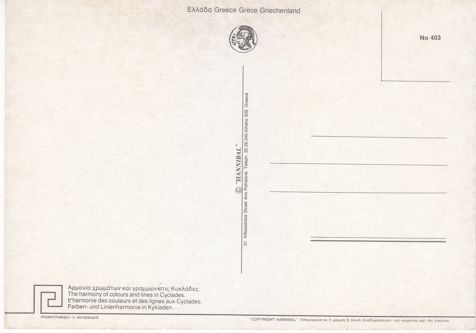 POSTCARD #081 Greece. [Also written in Greek, German, and another language.] The harmony of colours and lines in Cyclades. Copyright Hannibal. No. 403. 31, Kifissodotos Street Ano Petralona. Teleph. 32.29.340. Athens 309, Greece. 4.75" x 6.5" EXC