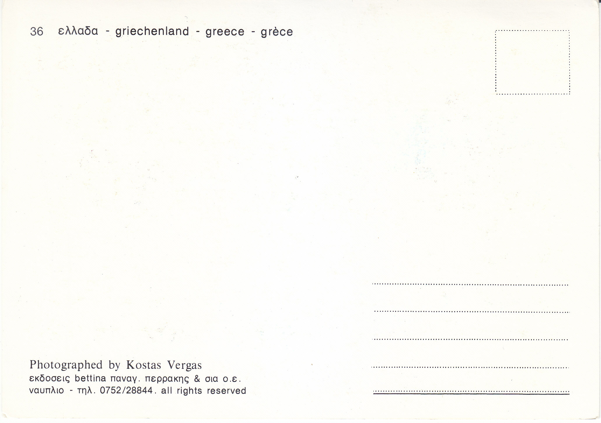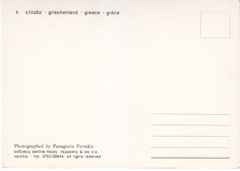 POSTCARD #079 Greece. [Also written in Greek, German, and another language; Address also in Greek.] Photographed by Panagiotis Perrakis. 6. All rights reserved. 4.75" x 6.5" EXC