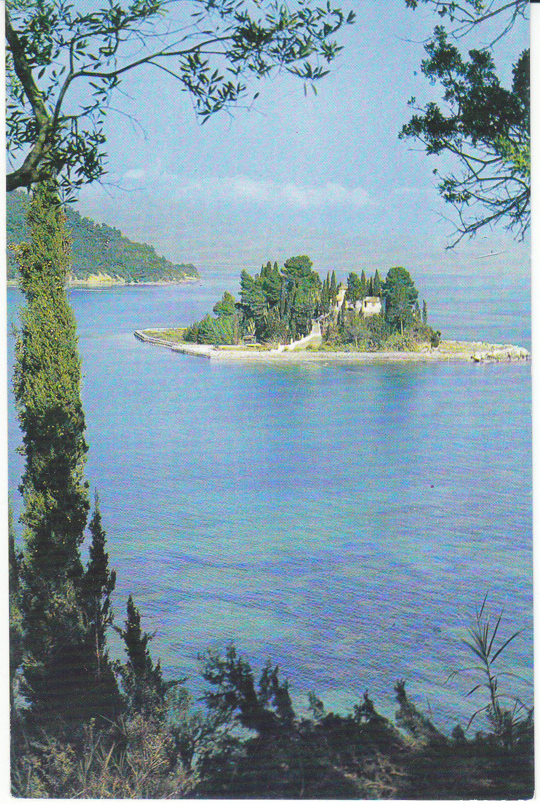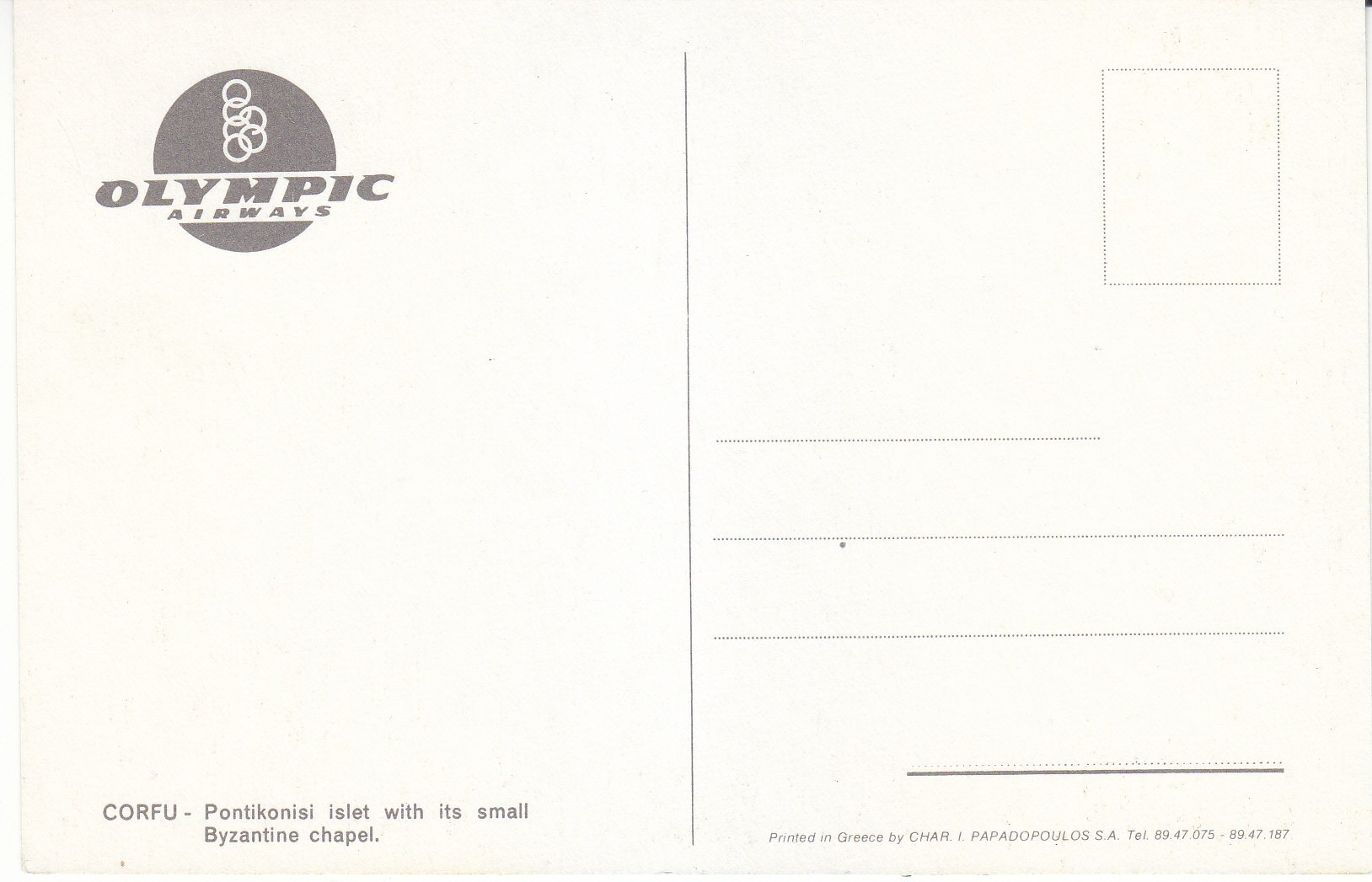 POSTCARD #089 Corfu, Greece. Pontikonisi islet with its small Byzantine chapel. Olympic Airways. Printed in Greece by Char I. Papadopoulos S.A. Tel 89 47 075 - 89 47 187. 3.5" x 4.25" EXC