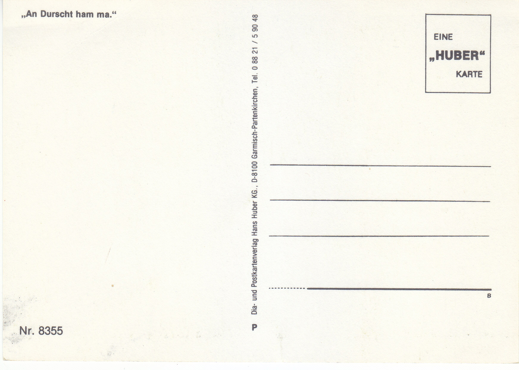 POSTCARD #131 "An Durscht ham ma." (Bavaria, Germany) Nr. 8355. Eine Huber Karte. Dia- und Postkartenverlag Hans Huber KG., D-8100 Garmisch-Partenkirchen [Bavaria, Germany] Tel. 0 88 21 / 5 90 48. 5.75" x 4" EXC