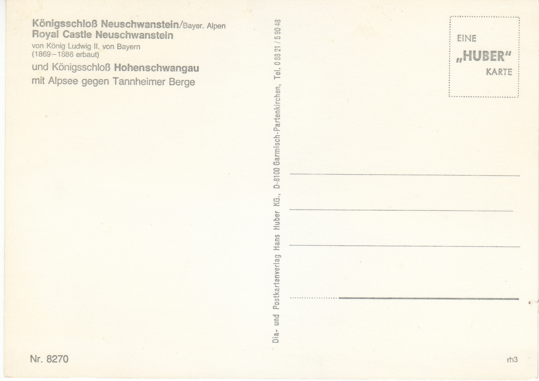 POSTCARD #133 Königsschloß Neuschwanstein/Bayer. Alpen. Royal Castle Neuschwanstein von König Ludwig II, von Bayern (1869-1886 erbaut). Nr. 8270. rh3. Eine Huber Karte. Dia- und Postkartenverlag Hans Huber KG., D-8100 Garmisch-Partenkirchen (Bavaria, Germany) Tel. 0 88 21 / 5 90 48. 4" x 5.75" EXC