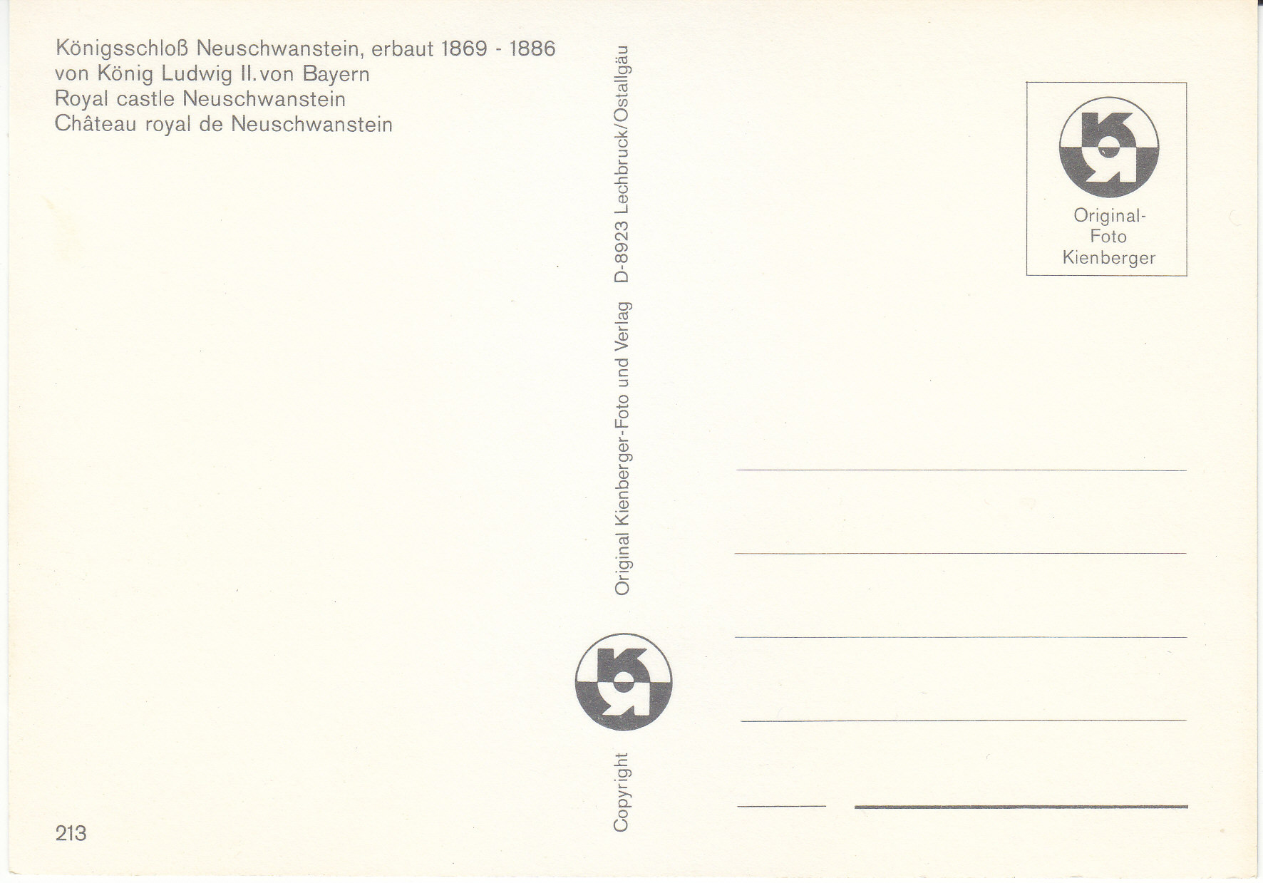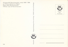 POSTCARD #134 Königsschloß Neuschwanstein/Bayer, erbaut 1869-1886 von König Ludwig II, von Bayern [Germany]. Royal Castle Neuschwanstein. 213. Original Foto Kienberger. Copyright Original Kienberger-Foto und Verlag, D-8923 Lechbruck/Ostallgäu. 5.75" x 4" EXC