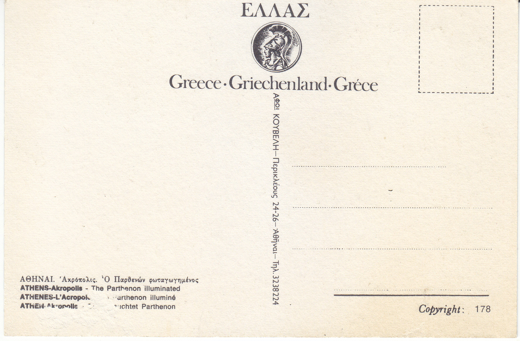 POSTCARD #138 Athens, The Parthenon Illuminated. Greece. Copyright: 178. [Address and other information in Greek.] 6" x 4" EXC