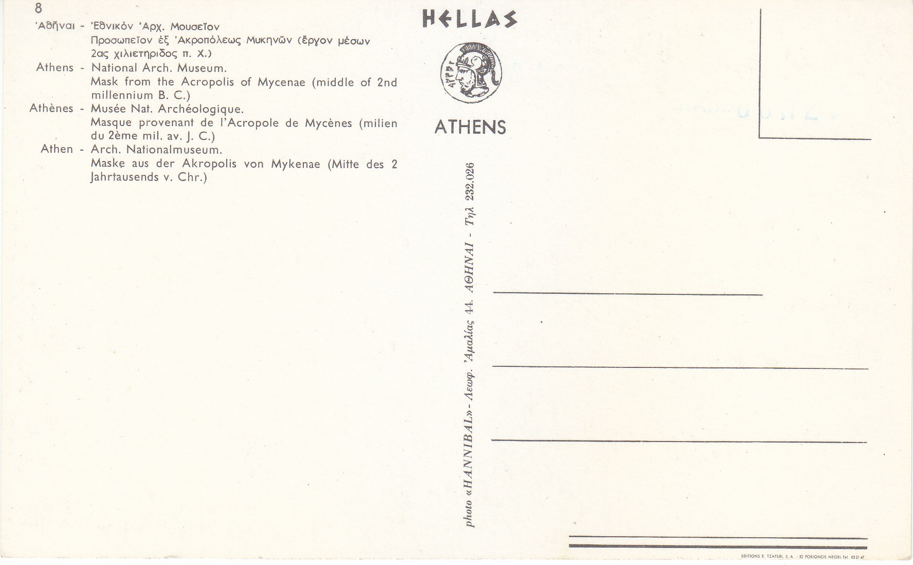 POSTCARD #167 Mask from the Acropolis of Mycenae (middle of 2nd millennium B.C.), National Arch. Museum. Athens [Greece.] 8. Photo Hannibal. [Address in Greek.] Hellas Athens. 6" x 3.75" EXC