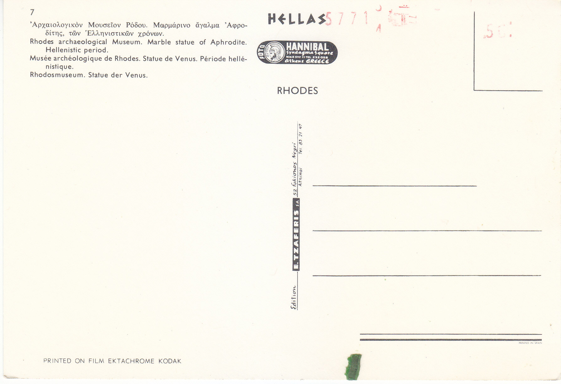 POSTCARD #168 Marble Statue of Aphrodite, Hellenistic period. 7. Rhodes Archaeological Museum. Rhodes, Greece. Edition E. Tzaferis SA 52 Fokionos, Athinai, Tel. 83 21 47. Hellas Rhodes [Greece]. Printed on Film Ektachrome Kodak.. 6" x 4" VG