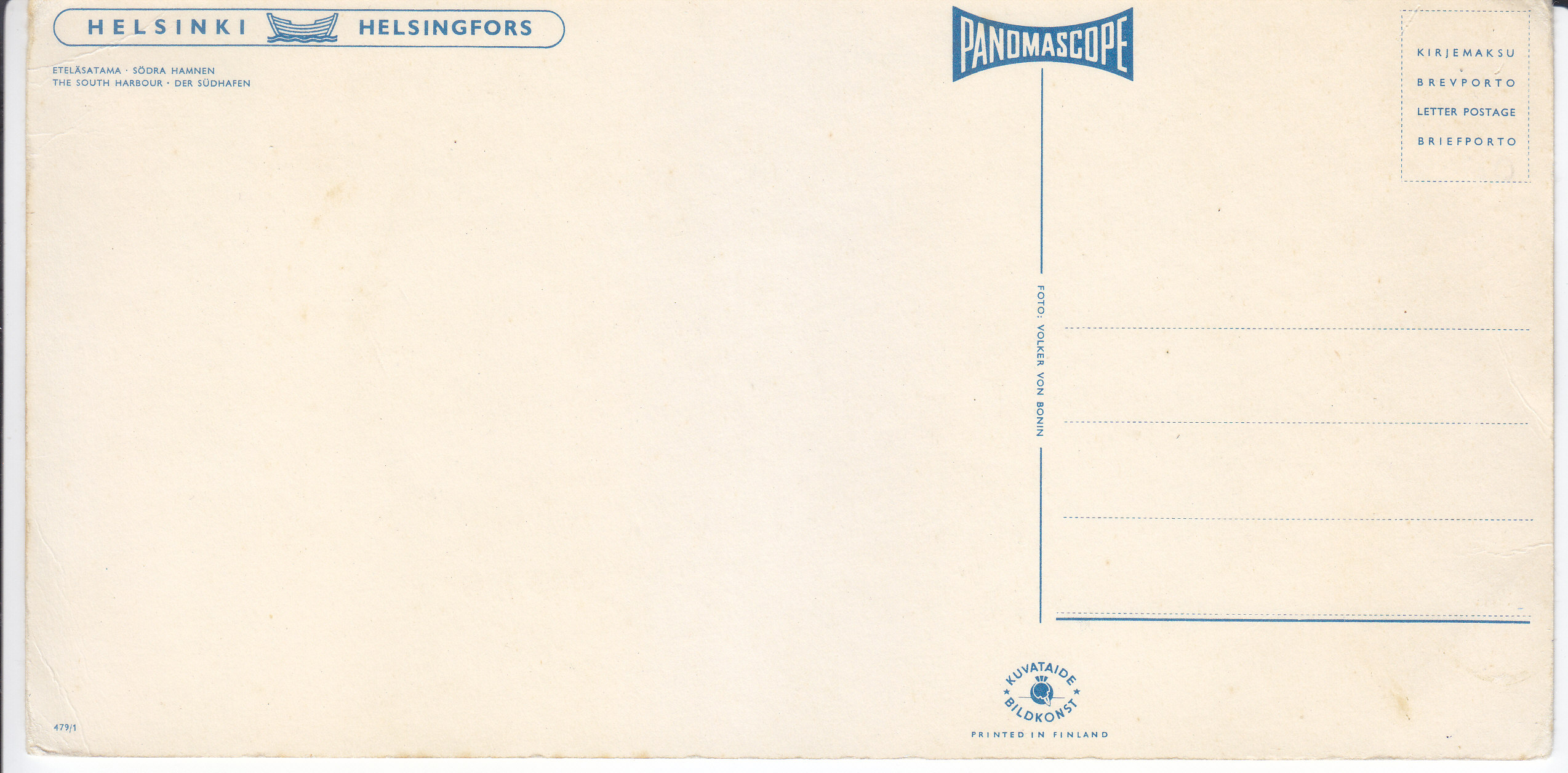 POSTCARD #190 The South Harbour, Helsinki [Finland]. Panomascope, Kuvataide Bildkonst. Printed in Finland. 479/1. 8.25" x 4" GD