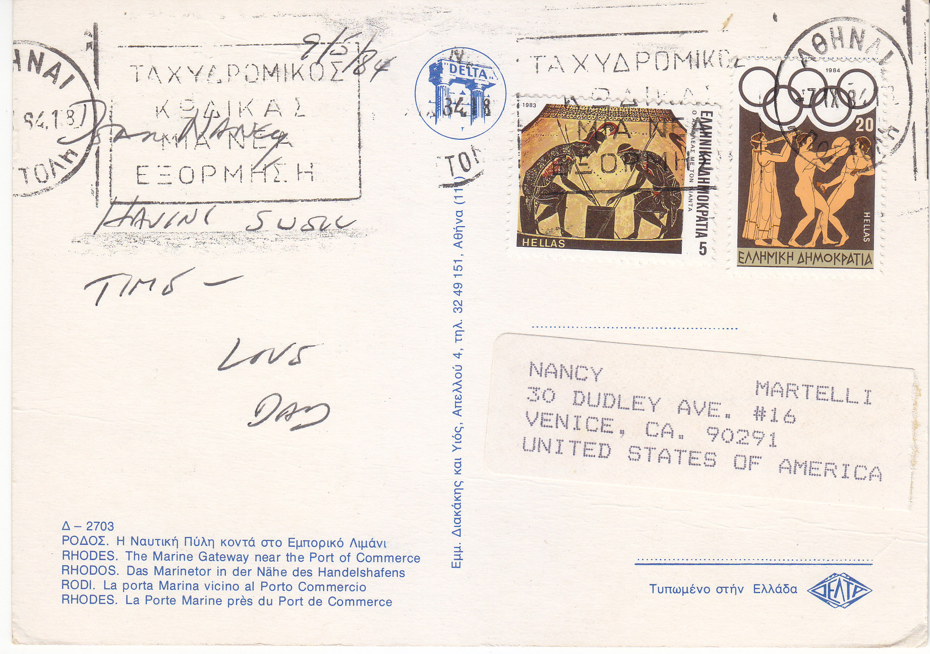 POSTCARD #208 Marine Gateway near the Port of Commerce, Rhodes [Greece]. Edition Delta. 2703. Delta. [Address and other information printed in Greek.]. 6" x 4.25" VG