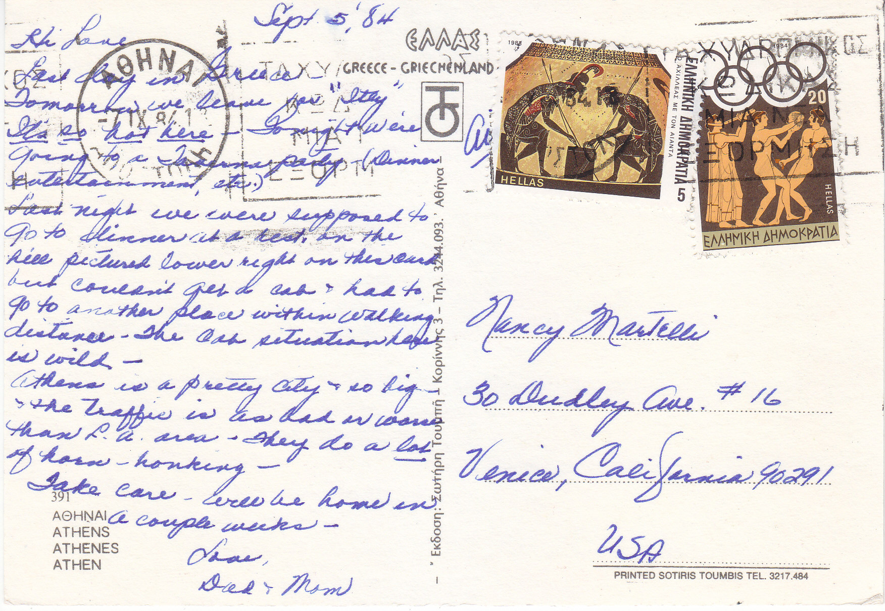POSTCARD #230 Athens [Greece]. 391. Greece. Printed Sotiris Toumbis, Tel. 3217.484. [Other writing in Greek.] 5.75" x 4" VG