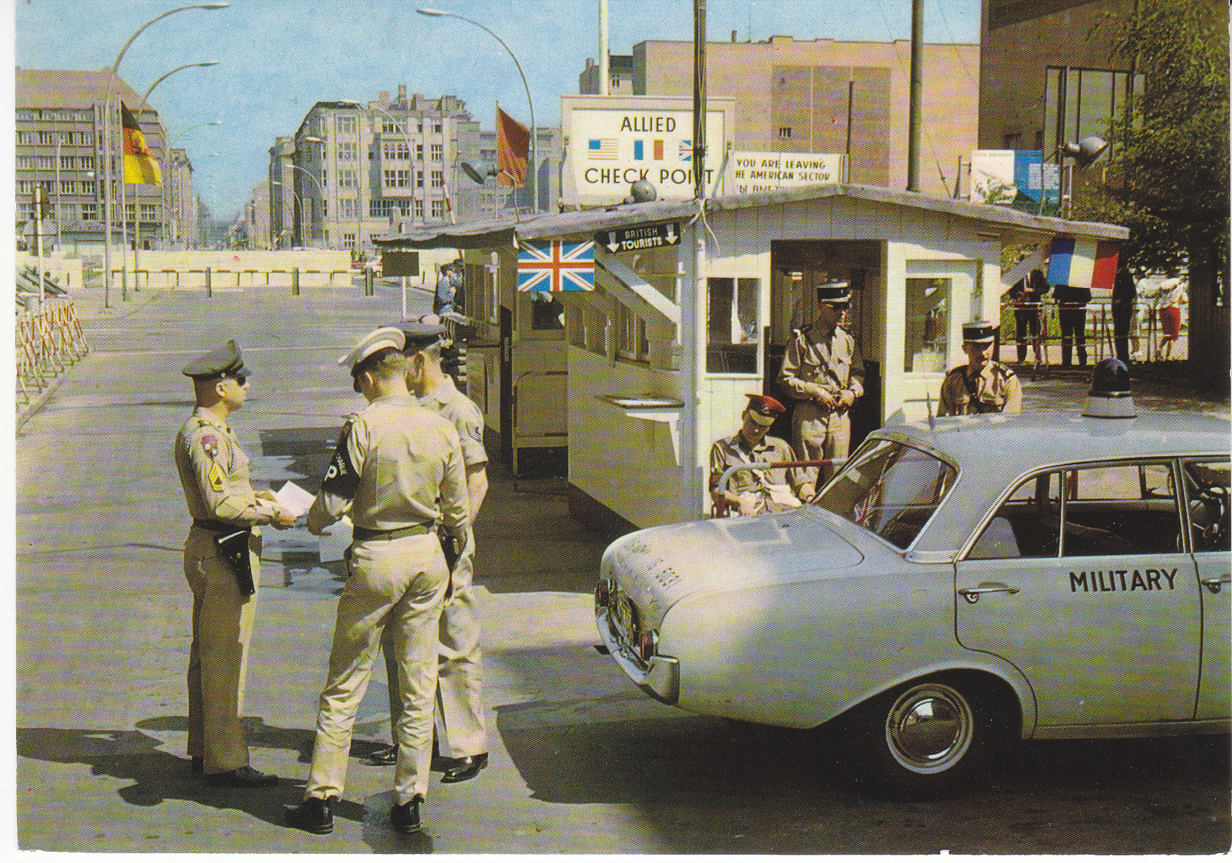 POSTCARD #242 Checkpoint Charlie, Berlin [Germany]. Schikkus, 1 Berlin 30, Tel. 2 61 11 19. Herst. u. Verlag Schöning & Co - Gebrüder Schmidt. 5.75" x 4" EXC
