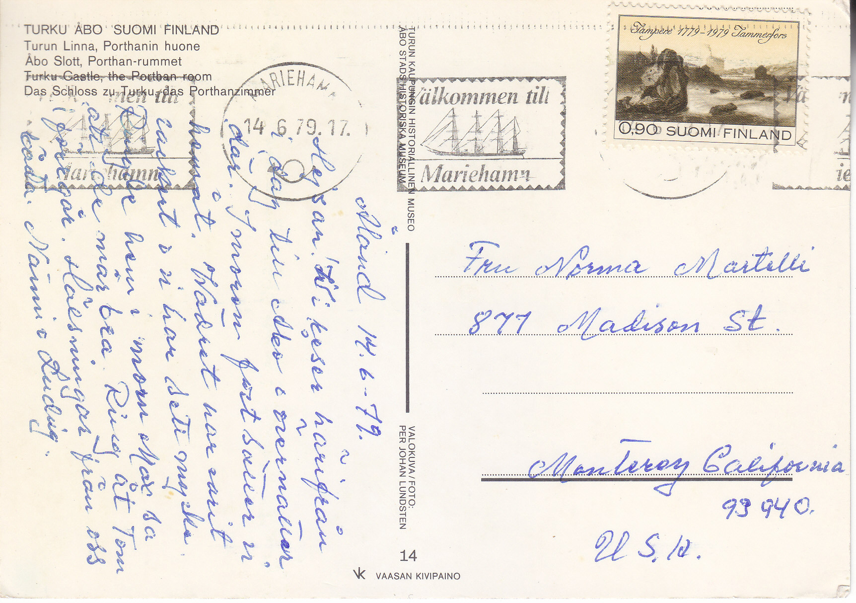 POSTCARD #245 The Portban Room, Turku Castle [Turku, Finland]. 14. Vaasan Kivipaino. Turun Kaupungin Histotiallinen Museo. Åbo Stads Historiska Museum. Valokuva/Foto: Per Johan Lundsten. 5.75" x 4" EXC