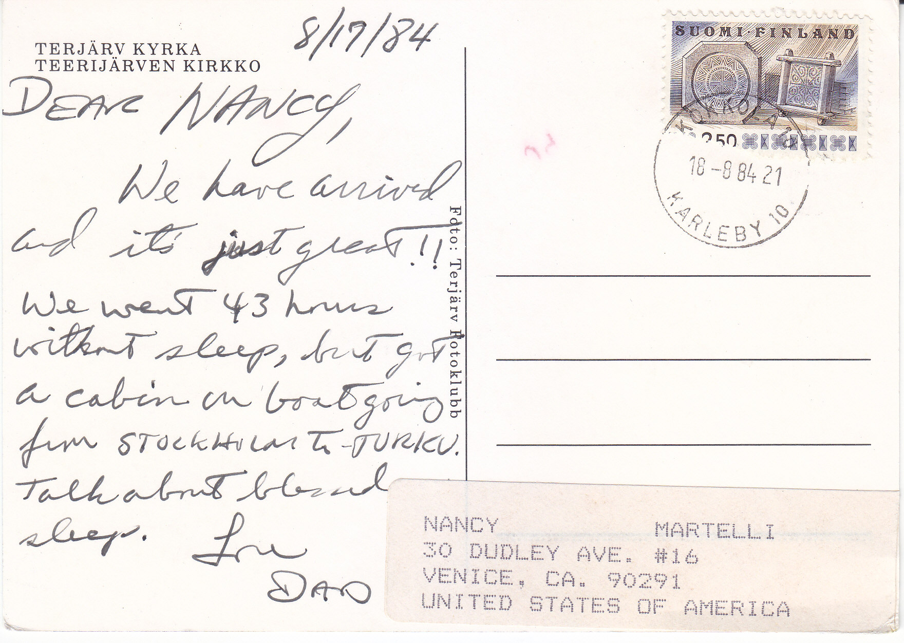 POSTCARD #249 Terjärv Kyrka (church). Terjärv [Suomi/Finland]. Foto: Terjärv Fotoklubb. 5.75" x 4" EXC