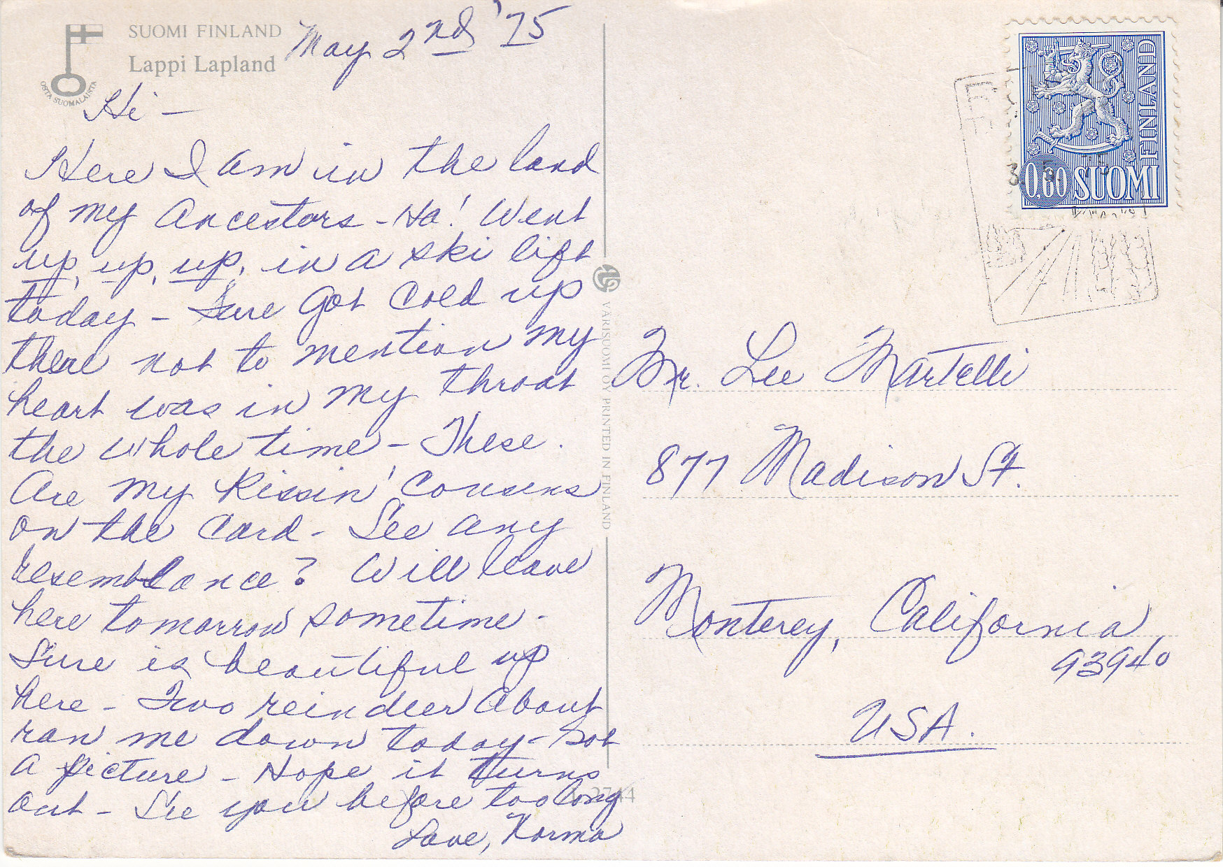 POSTCARD #252 Terveiset Lapista [Greetings from Lapland, Suomi/Finland]. L2744. Lappi Lapland, Suomi/Finland. Osta Suomalaista. Värisuomi Oy. Printed in Finland. 5.75" x 4" GD
