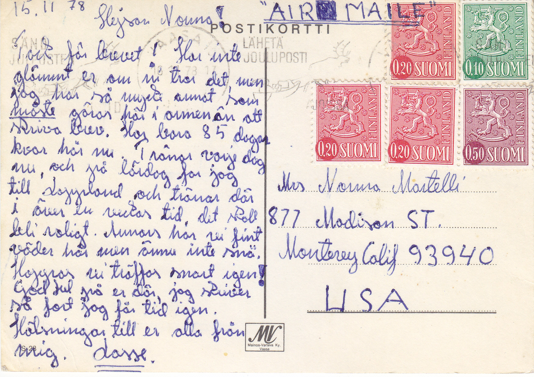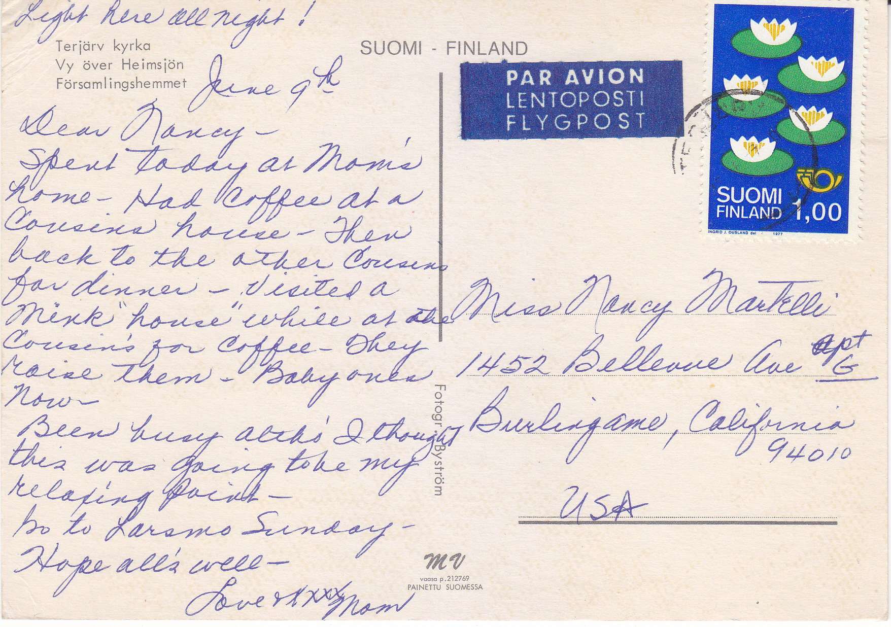 POSTCARD #254 Suomi-Finland. 425. [Probably a photo of Larsmo, Suomi/Finland.] GTR Tuonti Import. Groko. Foto: Giovanni Trimboli. 5.75" x 4" VG
