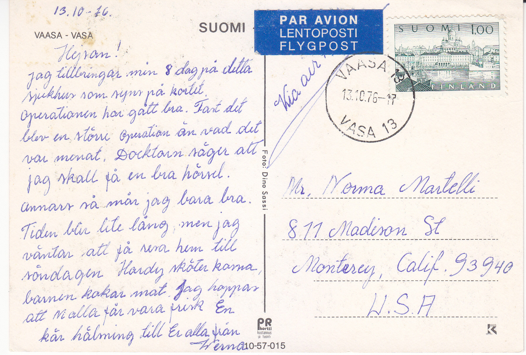 POSTCARD #261 Vaasa/Vasa [Suomi-Finland]. 10-57-015. Foto: Dino Sassi. PR Kortti Kustannus ja tuonti. 5.75" x 4" EXC