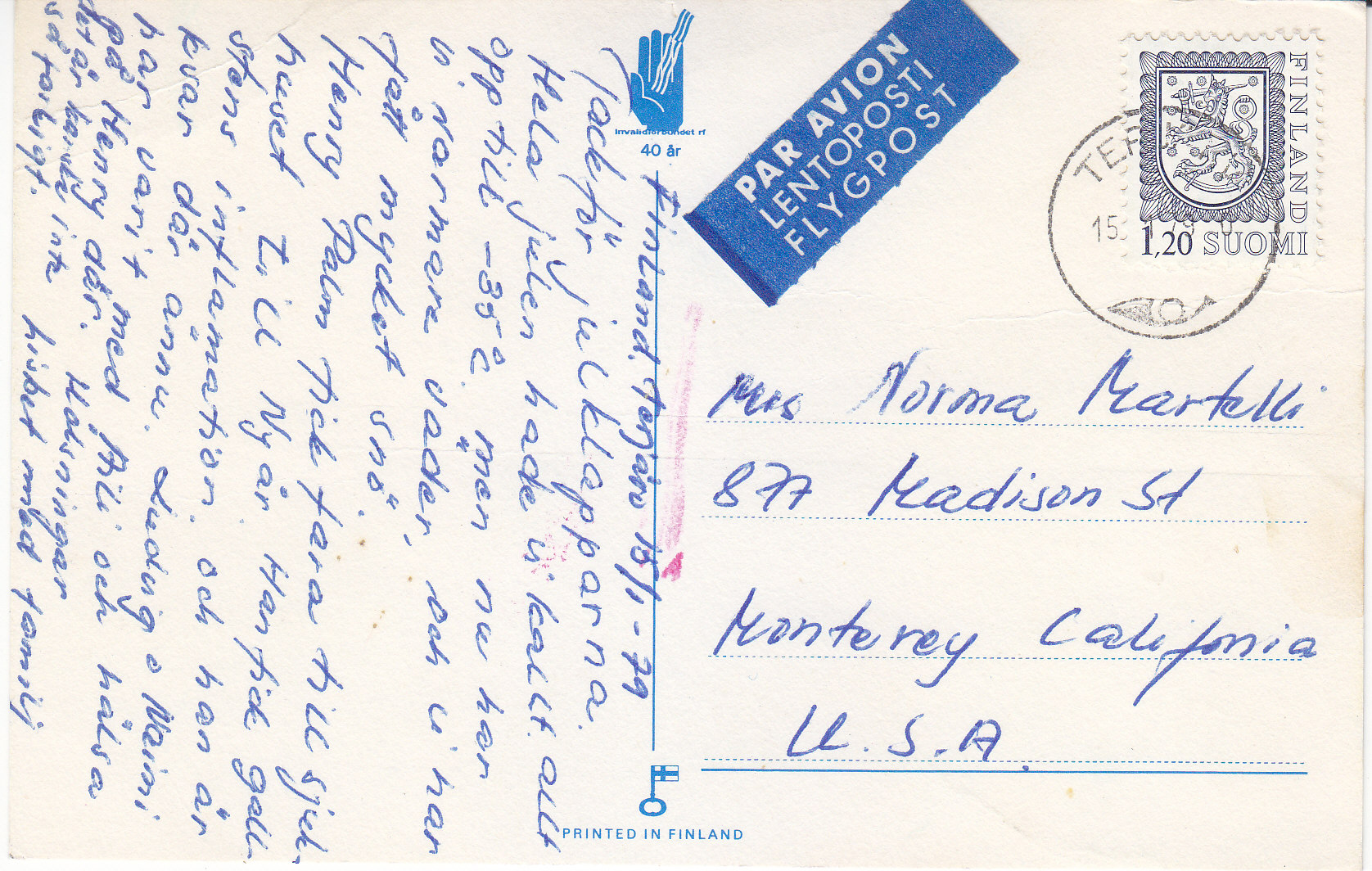 POSTCARD #263 Invalidforbundet rf 40 år [The disability association/union is 40, Suomi/Finland]. Printed in Finland. 5.5" x 3.5" GD