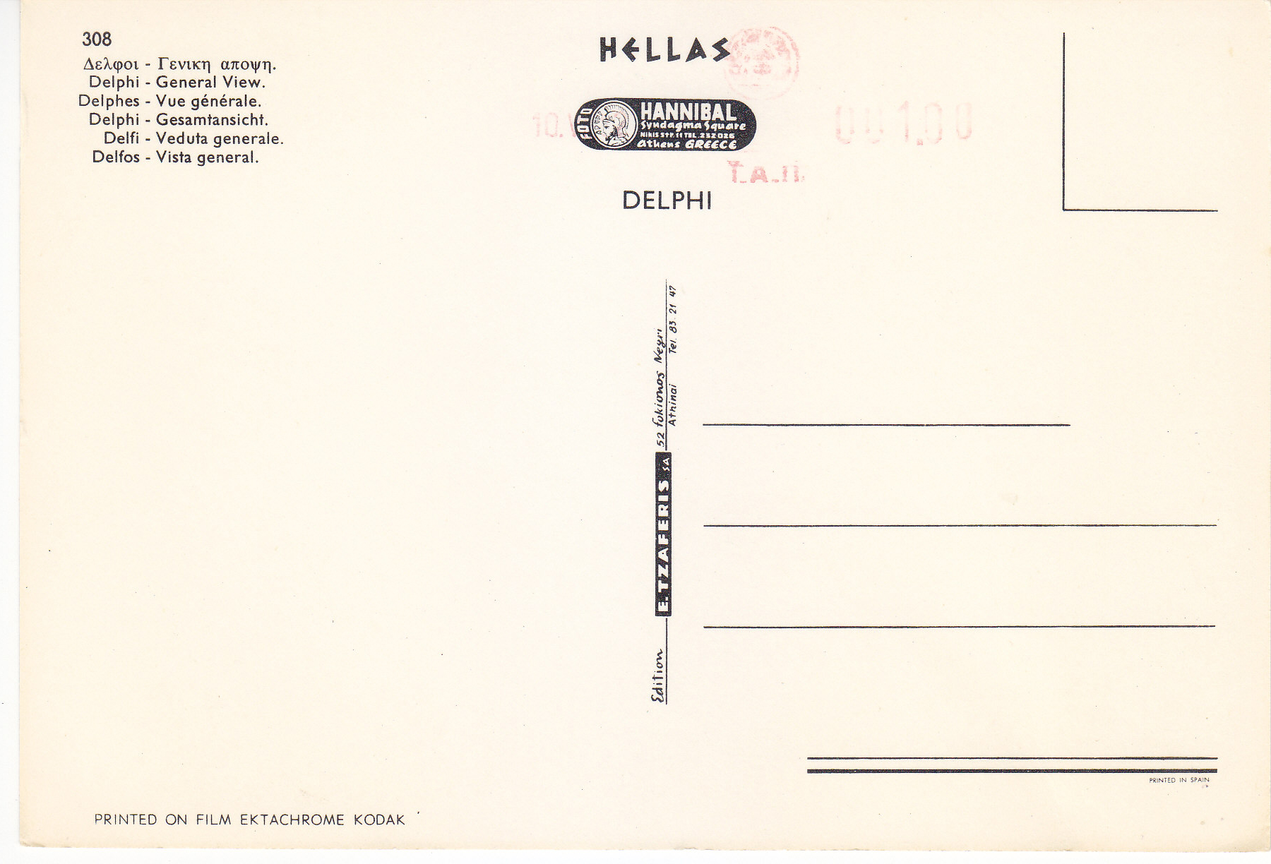 POSTCARD #317 General View, Delphi [Greece]. 308. Hellas. Foto Hannibal Syndagma Square, Nikis Str, 11, Tel 232 026, Athens, Greece. Printed on Film Ektachrome Kodak. 6" x 4" EXC