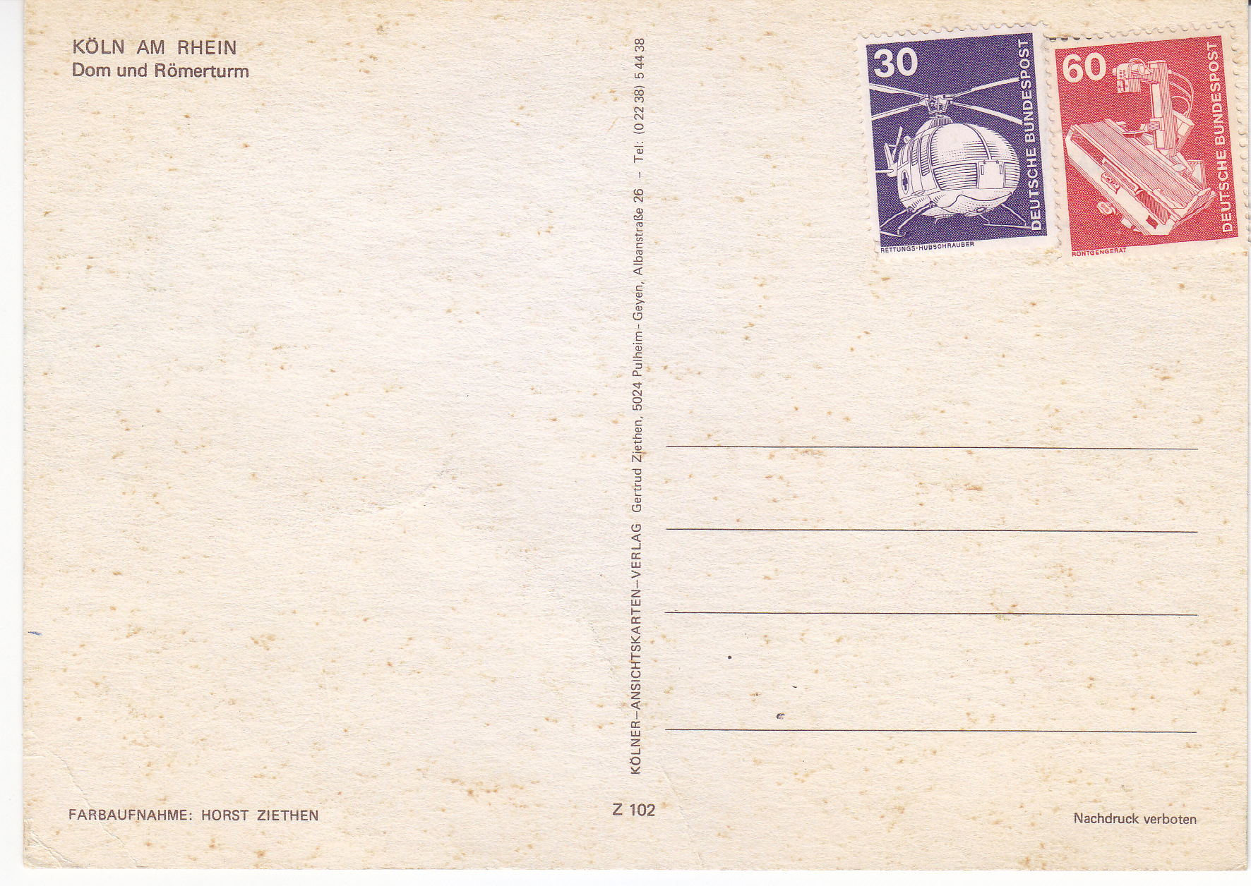 POSTCARD #324 Köln am Rhein [Cologne on the Rhein River, Cologne, Germany]. Dom und Römerturm. Farbaufnahme: Horst Ziethen. Z102. Nachdruck Verboten. Kölner-Anischtskarten-Verlag. Gertrud Ziethen, 5024 Pulheim, Geyen, Albanstrasse 26. Tel. (0 22 38) 5 44 38. 5.75" x 4" VG