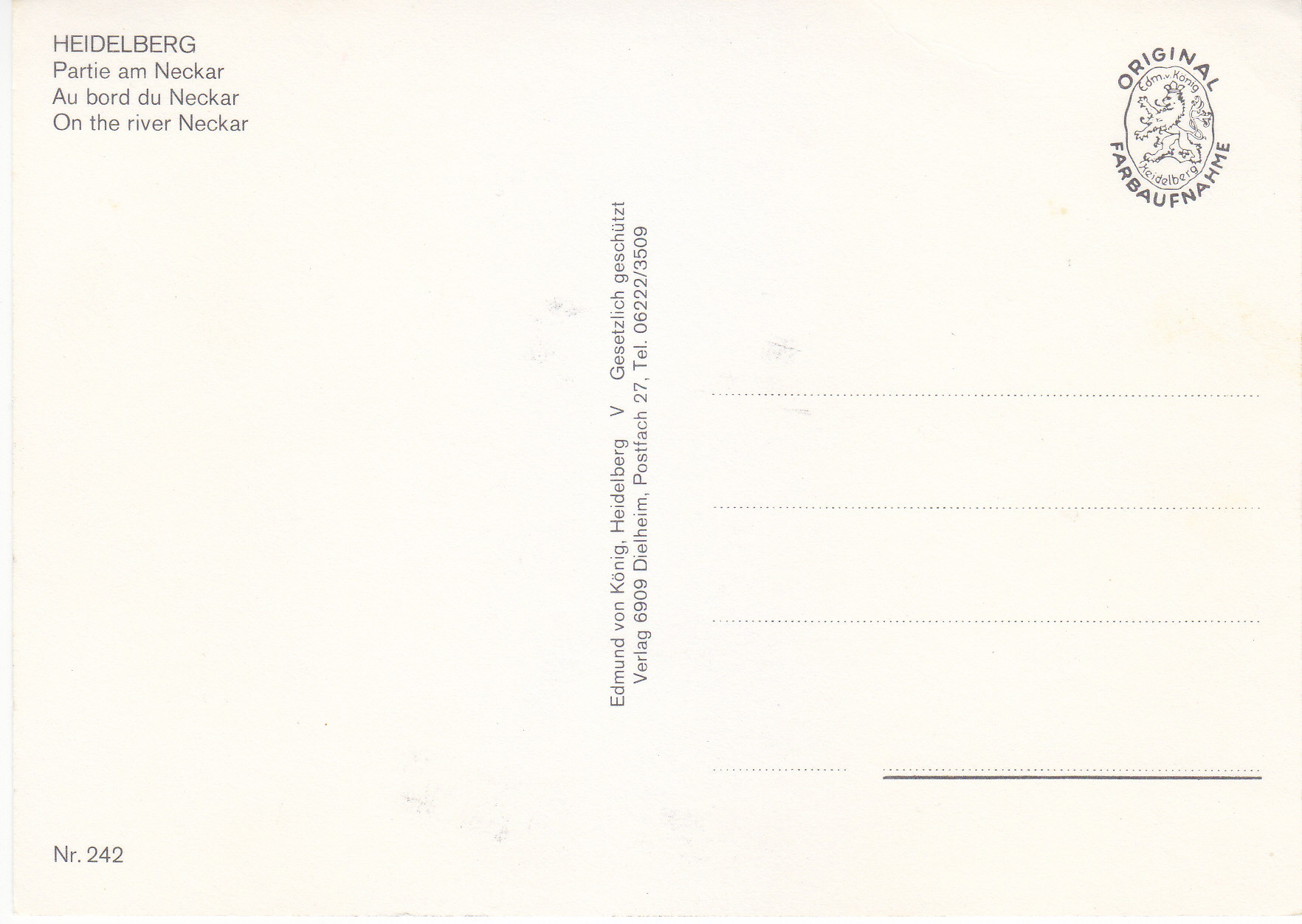 POSTCARD #329 Ich hab mein Herz in Heidelberg verloren [I lost my heart in Heidelberg]. On the Neckar River. Heidelberg [Germany]. Nr. 242. Edmund von König, Heidelberg V Gesetzlich geschützt. Verlag 6909 Dielheim, Postfach 27, Tel. 06222/3509. Original Farbaunahme. 5.75" x 4" EXC