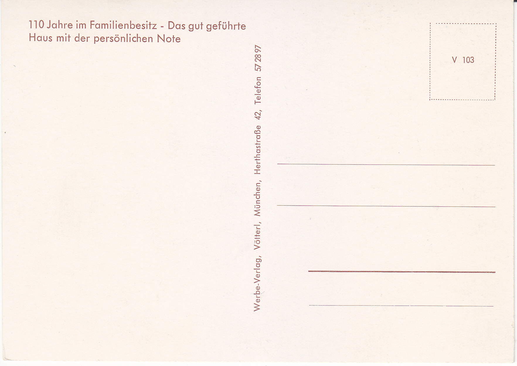 POSTCARD #372 Hotel Lindner, Bad Aibling [Bavaria, Germany]. 110. Jahre im Familienbesitz. Das gut geführte. Haus mit der persönlichen Note. [Family-owned for years. A well run Hotel with the personal touch]. Werbe-Verlag, Vötterl, München, Herthastrasse 42, Telefon 57 28 97. V 103. 5.75" x 4" EXC