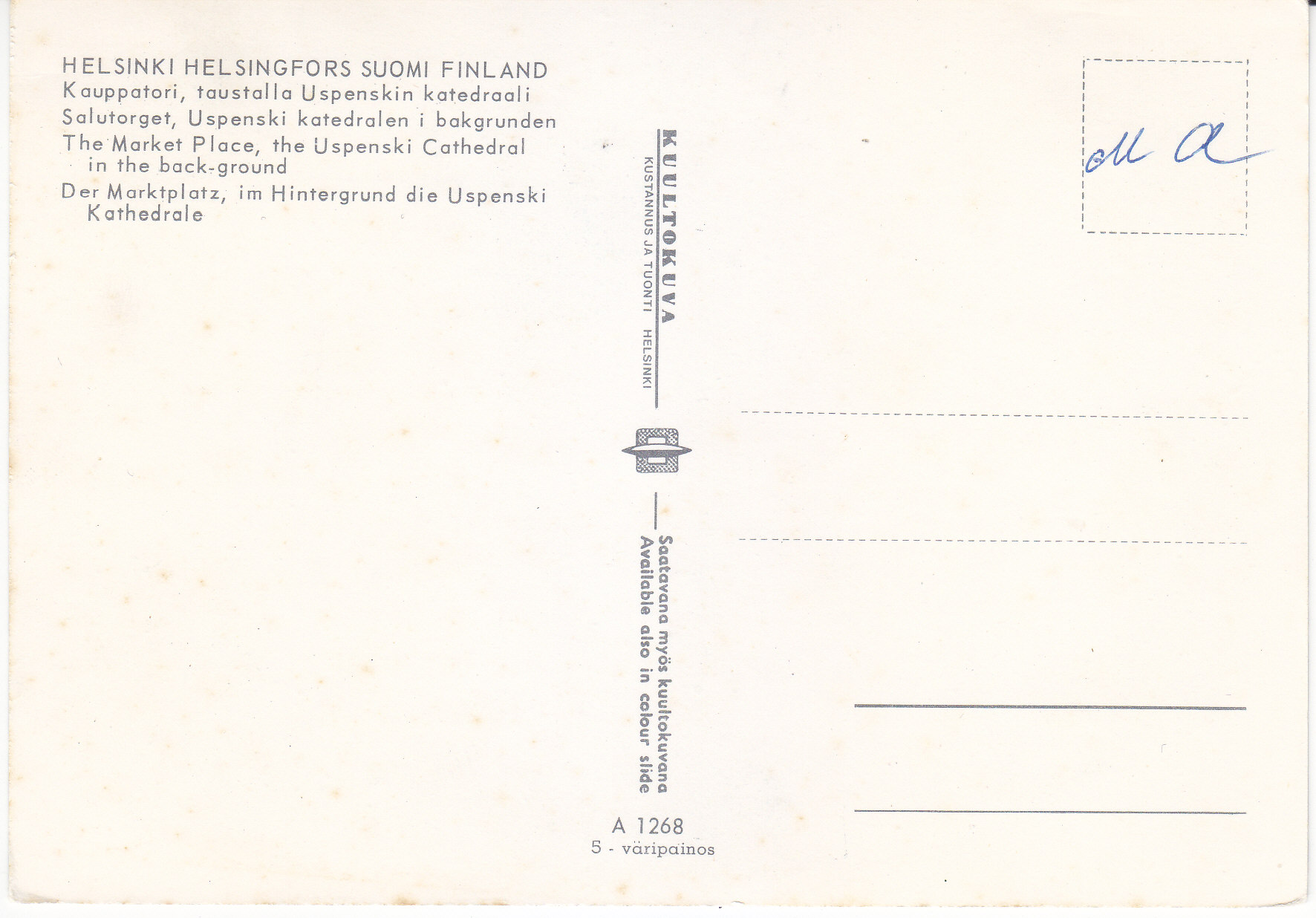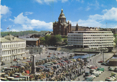 POSTCARD #373 The Market Place, the Uspenski Cathedral in the background. Helsinki/Helsingfors, Suomi/Finland. A 126B. 5-väripainos. Kultokuva. Kustannus Ja Tuonti, Helsinki [Suomi/Finland]. Saatavana myös kuultokuvana. Available also in colour slide. 6" x 4" GD