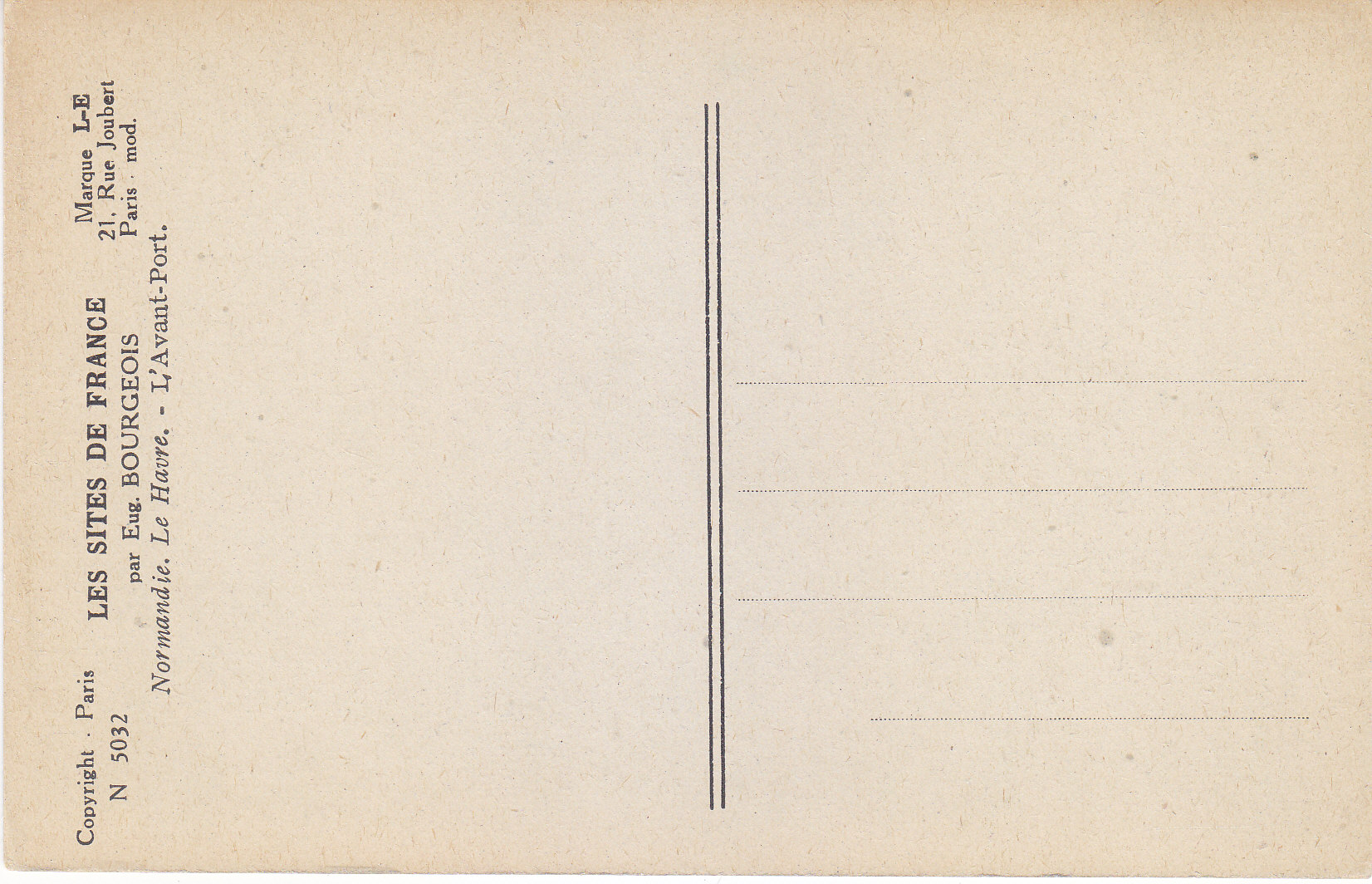 POSTCARD #439 L'Avant-Port [Outer Port], Le Havre, Normandie, France. Les Sites de France par Eng. Bourgeois. N. 5032. Copyright Paris. Marque L-E, 21 Rue Joubert, Paris, mod. 5.5" x 3.5" VG