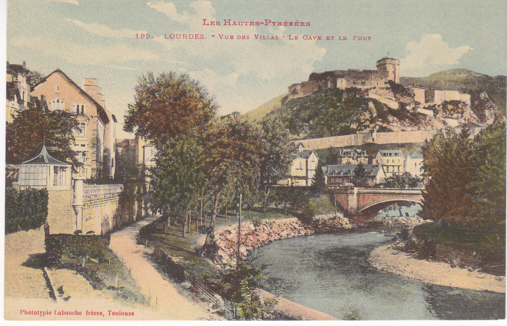 POSTCARD #445 Vue des Villas, Le Gave [the river] et le Fort, Lourdes, Les Hautes-Pyrénées, [France]. 199. Phototypie Labouche frères, Toulouse [France]. 5.5" x 3.5 EXC