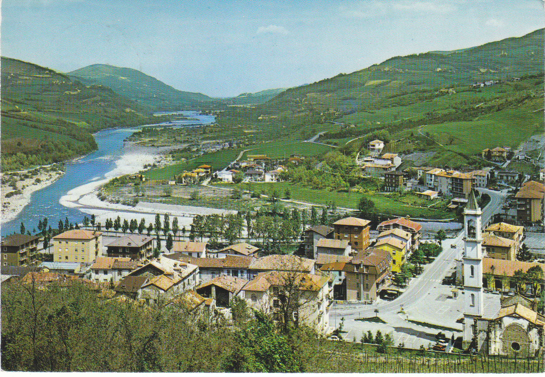 POSTCARD #046 Panorama, Perino, Fiume Trebbia [Trebbia River], Italy. Ed. Mascheroni, Lodi. Printed in Italy. Bromofoto Autocromo, Milano [Milan, Italy]. 5.75" x 4" EXC