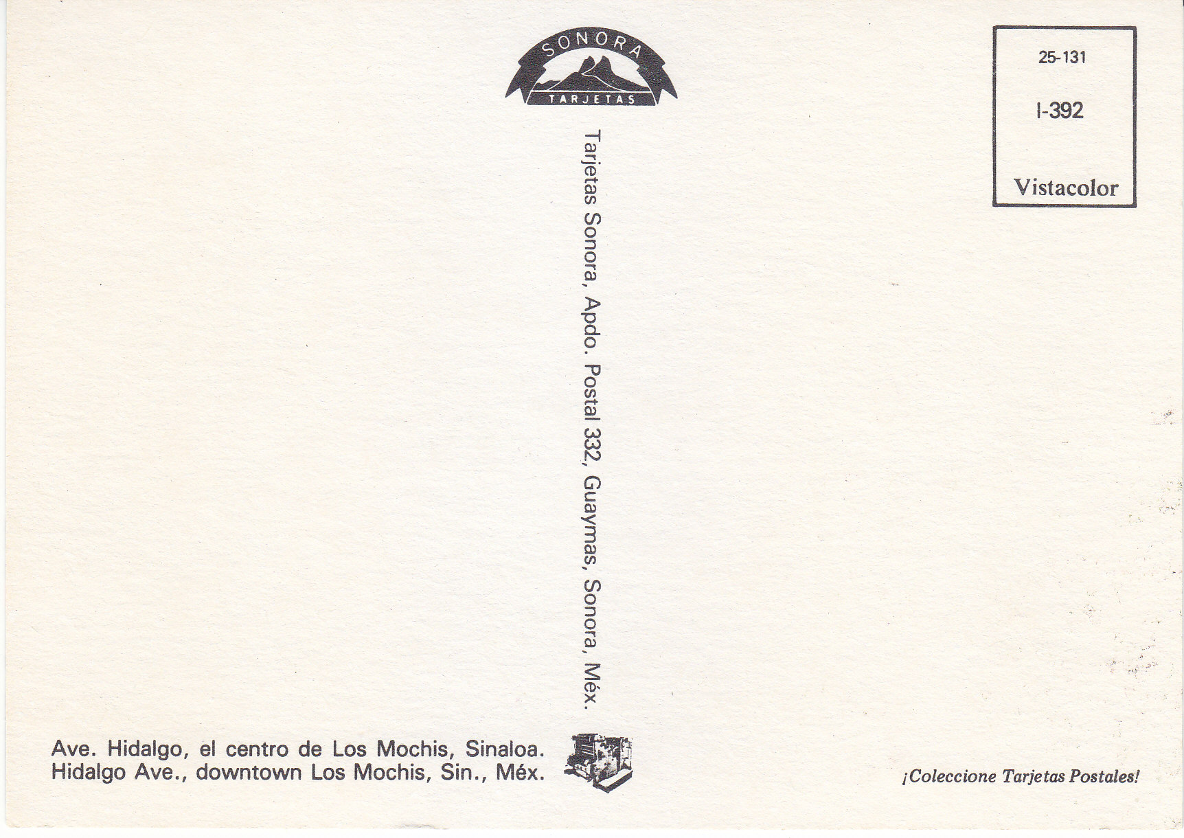 POSTCARD #050 Ave. Hidalgo, el centro de Los Mochis, Sinaloa, México. Coleccione Tarjetas Postales, Sonora Tarjetas, Apdo. Postal 332, Guaymas, Sonora, México. 5.75" x 4" EXC