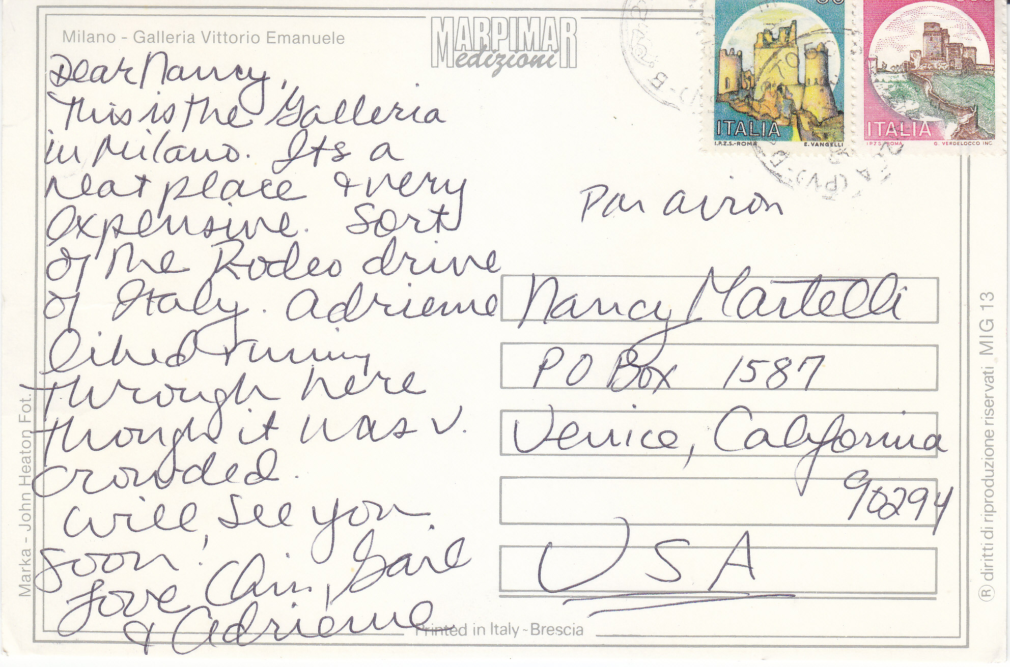 POSTCARD #157 Galleria Vittorio Emanuele, Milano [Milan, Italy]. Marka-John Heaton Fot. ®diritti di riproduzione riservati. MIG 13. Marpimar edizioni. Printed in Italy-Brescia. 6.5" x 4.25" VG