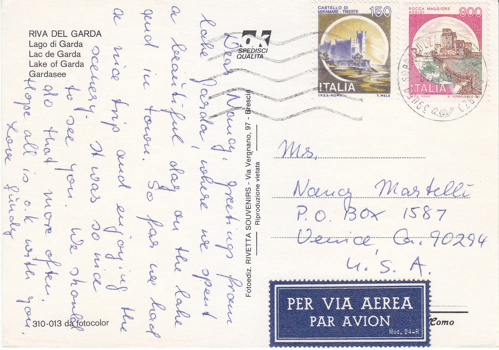 POSTCARD #159 Riva del Garda [Lake Garda] [Trento, Italy]. 310-013 da fotocolor. Fotoediz. Rivetta Souvenirs. Via Vergnano, 97, Brescia [Italy]. Riproduzione vietata. Spedisci Qualita. 5.75" x 4" EXC