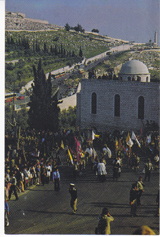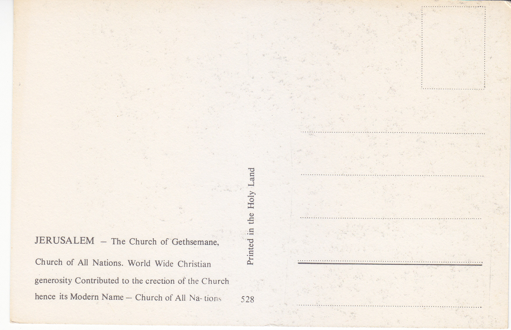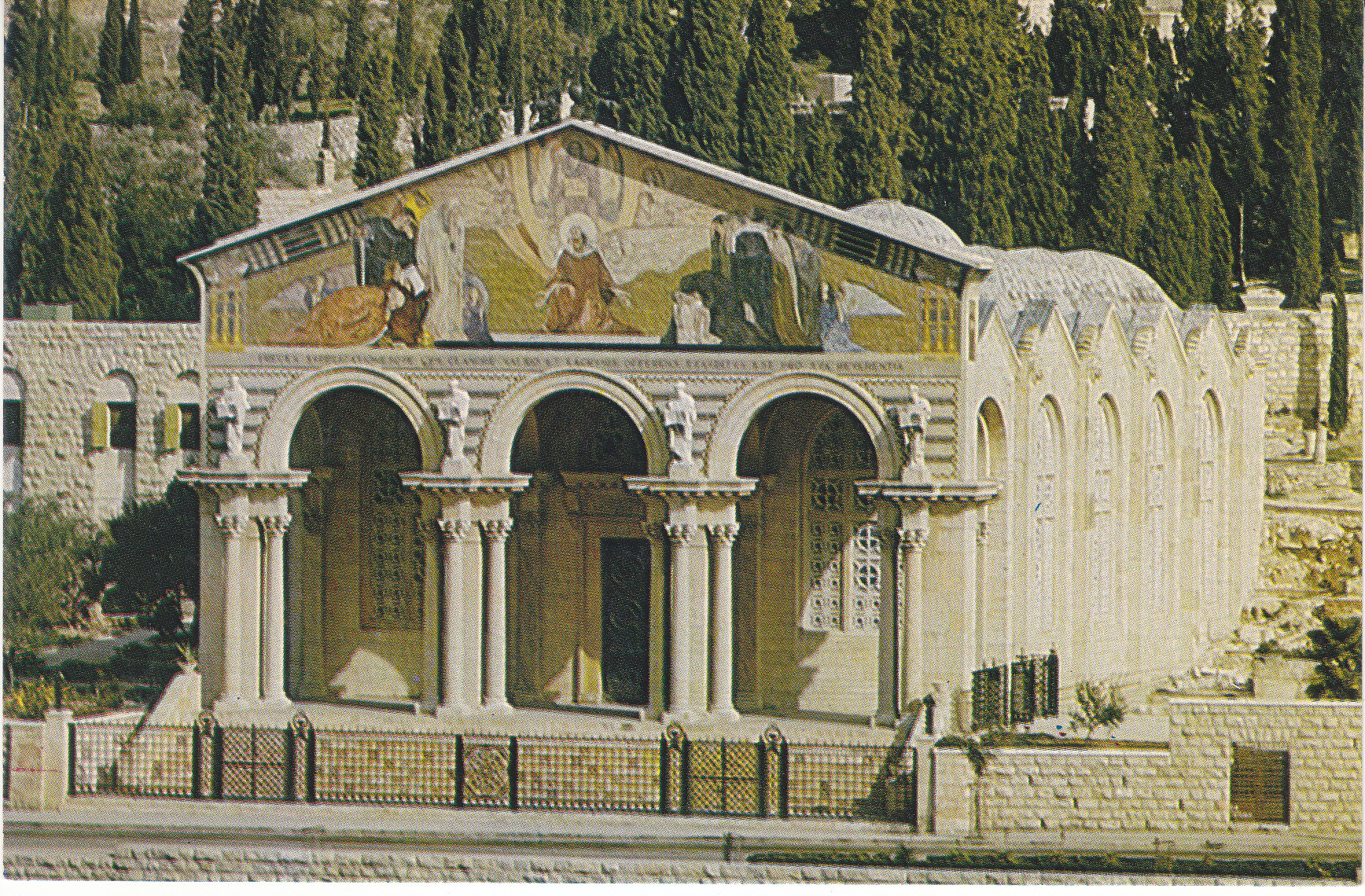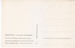 POSTCARD #330 Church of Gethsemane/Church of All Nations, Jerusalem [Israel]. World Wide Christian generosity Contributed to the erection of the Church hence its Modern Name, Church of All Nations. 528. Printed in the Holy Land. 5.75" x 3.75" EXC