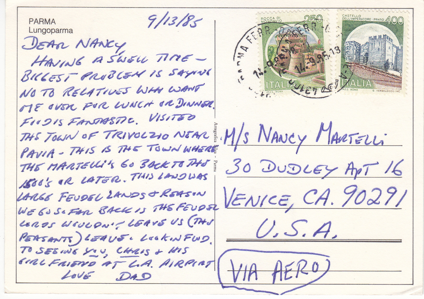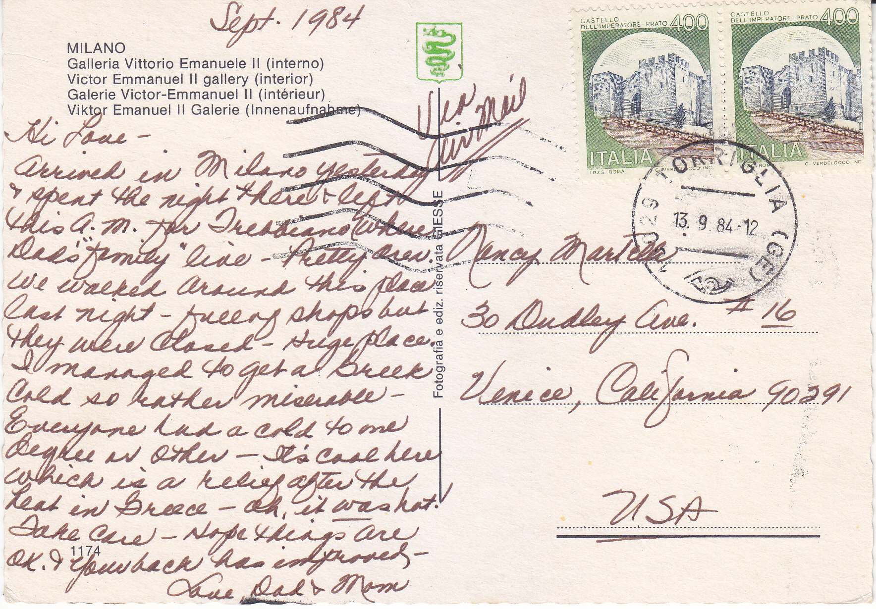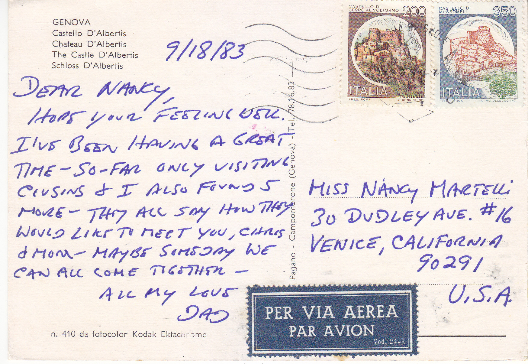 POSTCARD #217 Castello d'Albertis, Genova [Genoa, Italy]. n. 410. da fotocolor Kodak Ektachrome ... Pagano, Campomorone [Genova/Genoa, Italy]. Tel. 78.16.83. 5.75" x 4" VG