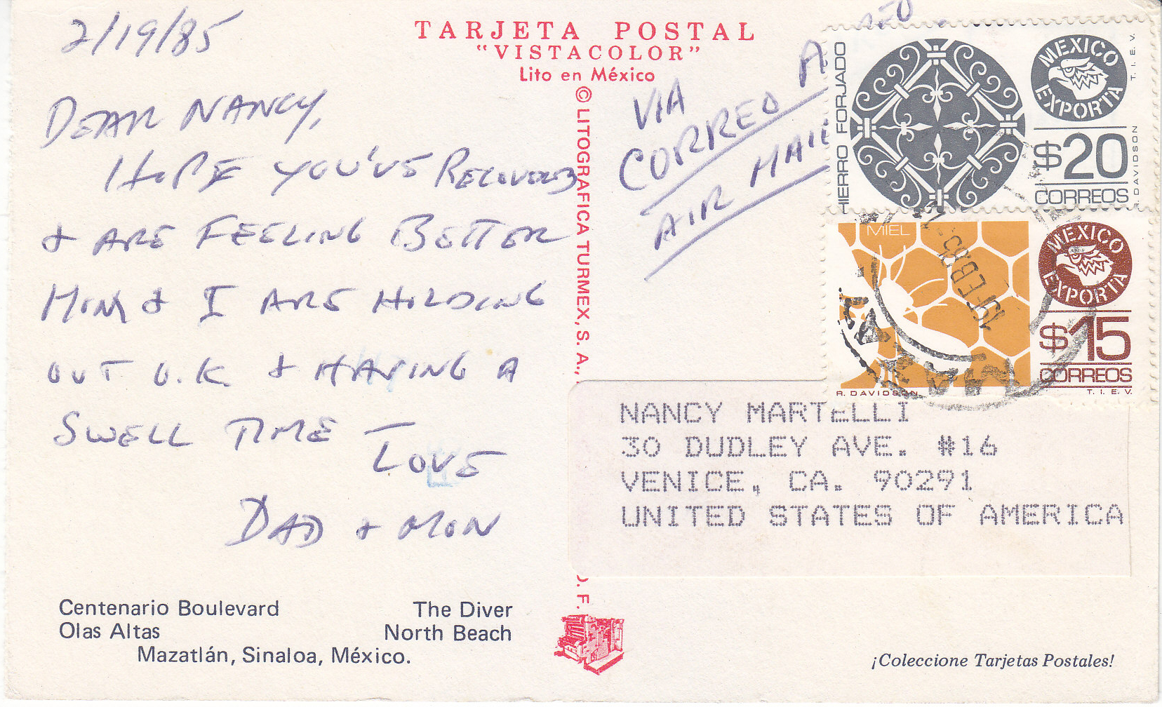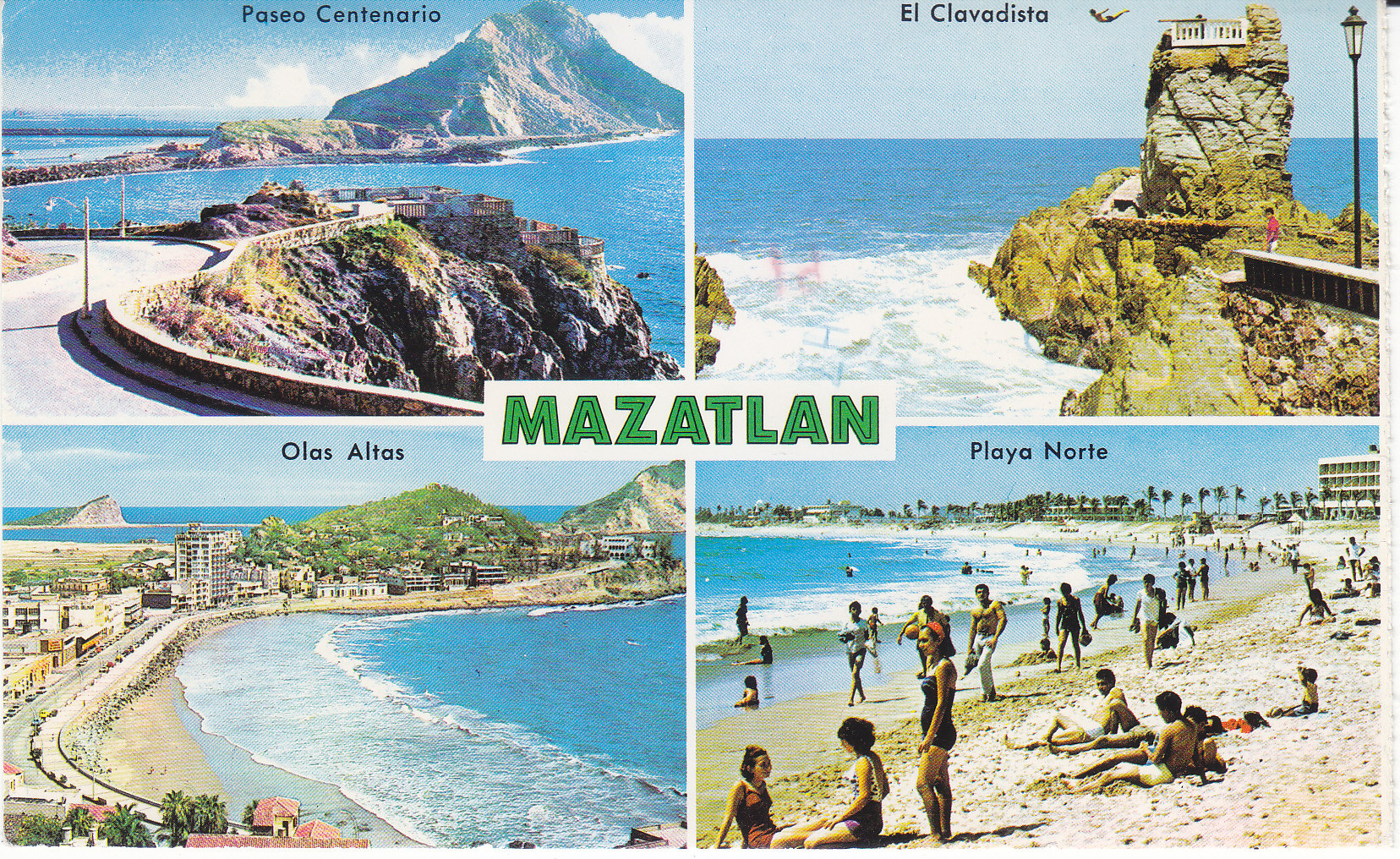 POSTCARD #206 Mazatlán [Sinaloa, Mexico]. Paseo Centenario. El Clavadista. Olas Altas. Playa Norte. Tarjeta Postal Vistacolor. Lito en México. Litografica Turmex, S.A. [Address obscured by mailing label.] Coleccione Tarjetas Postales! 5.5" x 3.5" VG