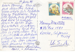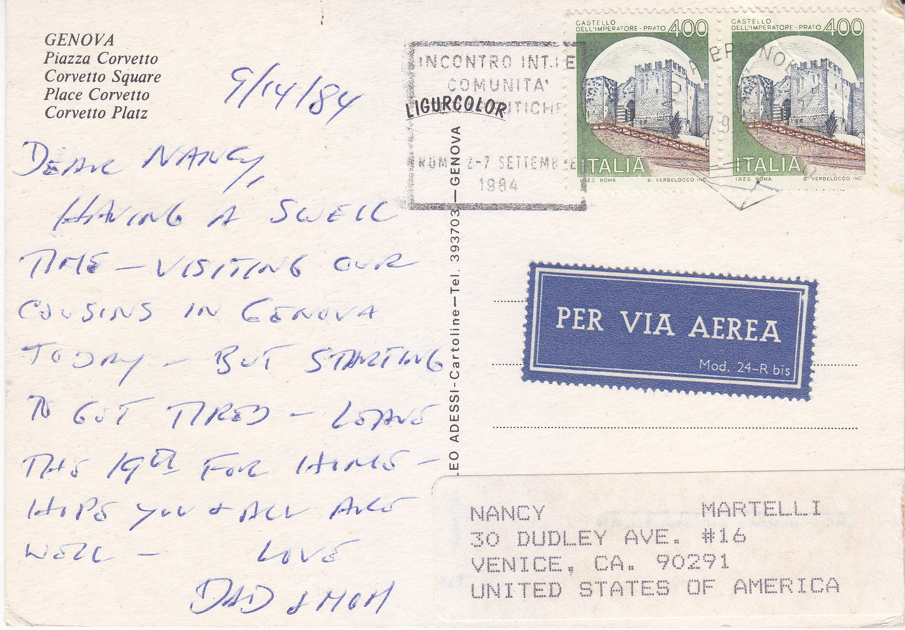 POSTCARD #207 Piazza Corvetto, Genova [Genoa, Italy]. Ligurcolor. [Address partly illegible due to mailing label]. Cartoline-Tel. 393703-Genova [Genoa, Italy]. 5.75" x 4" GD