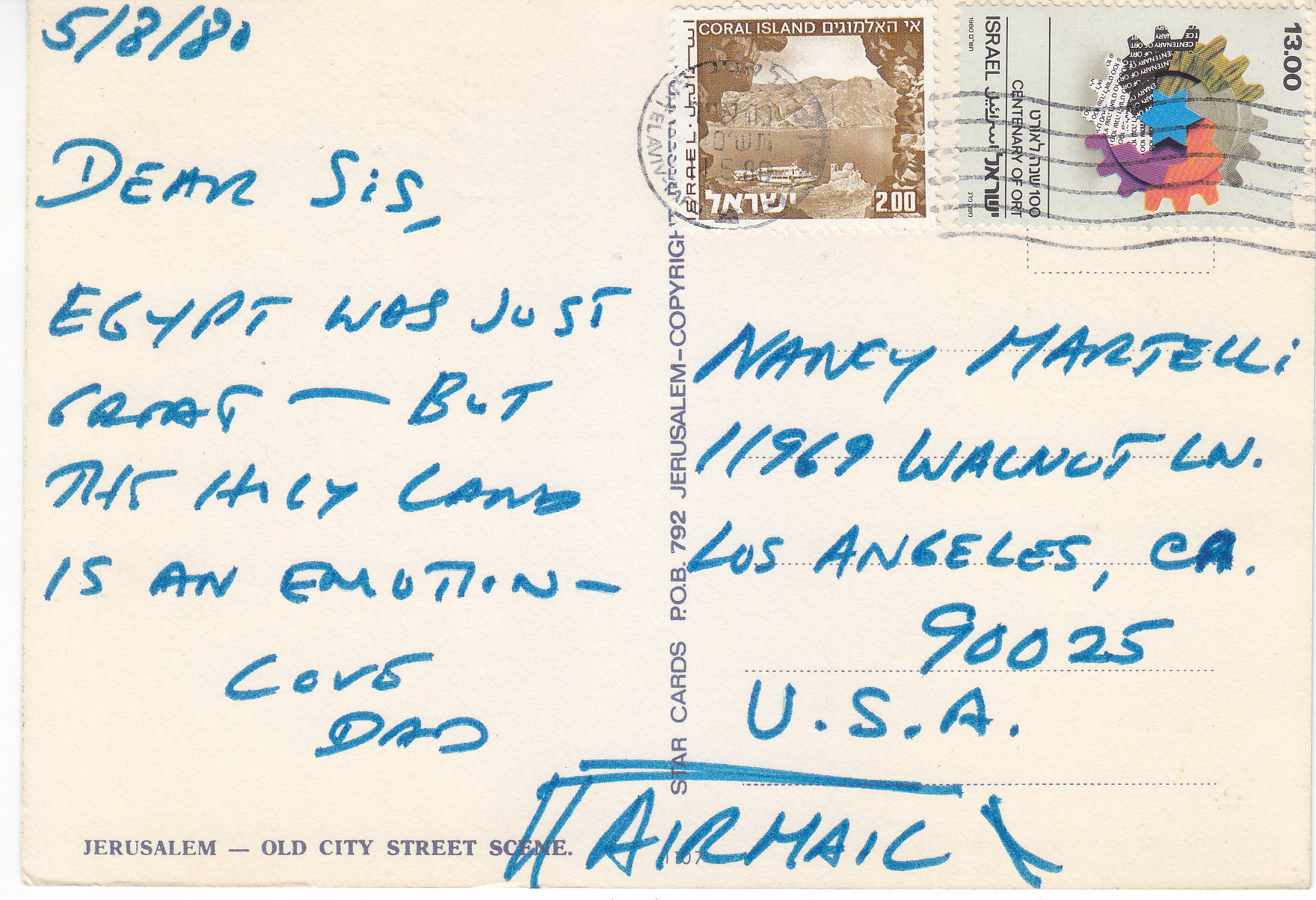 POSTCARD #216 Old City Street Scene, Jerusalem [Israel]. 1107. Star Cards, P.O. B. 792, Jerusalem. Copyright ... [Rest of text is under stamp.] 5.75" x 4" EXC