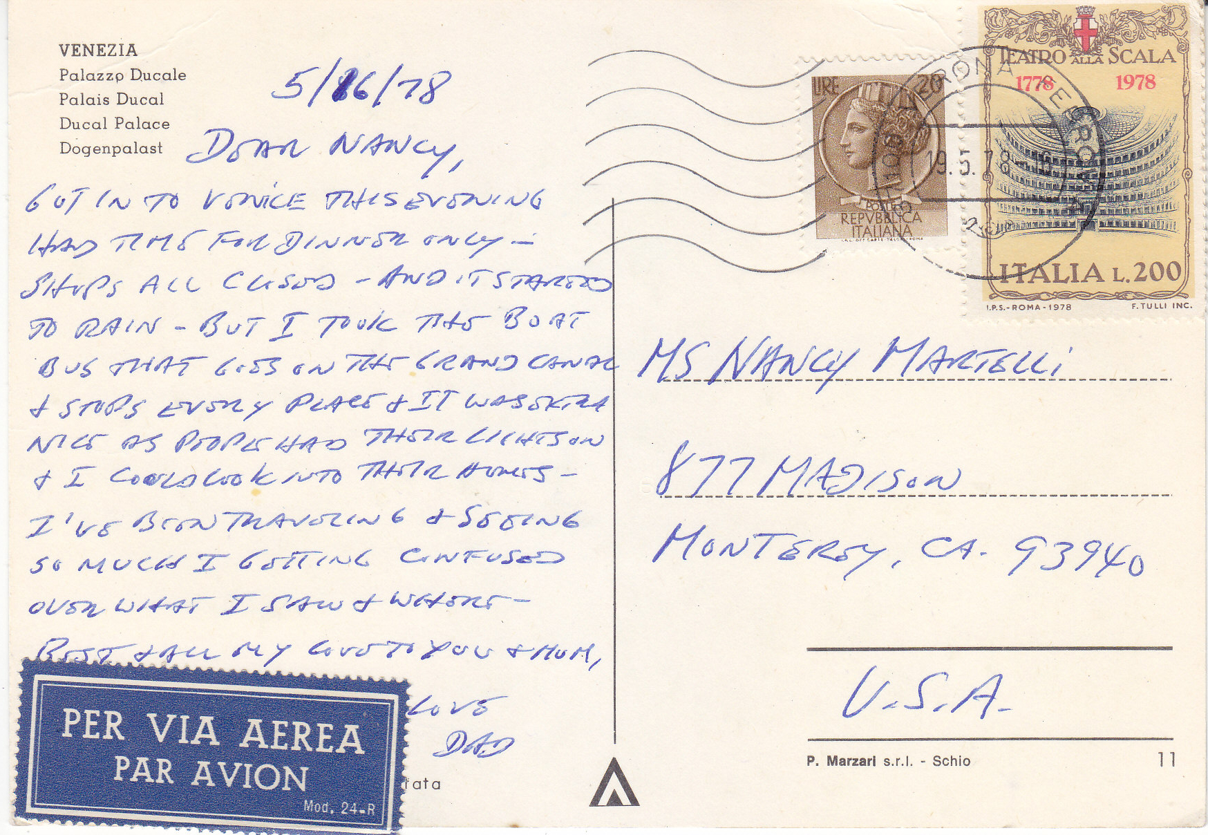 POSTCARD #220 Ducal Palace, Venezia [Venice, Italy]. P. Marzari s.r.l. Schio. Riproduzione Vietata. 5.75" x 4" VG