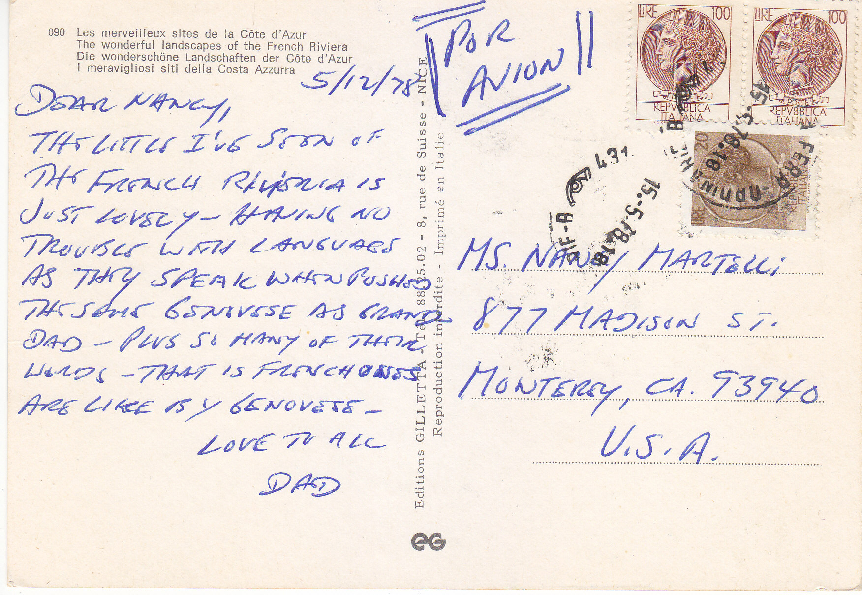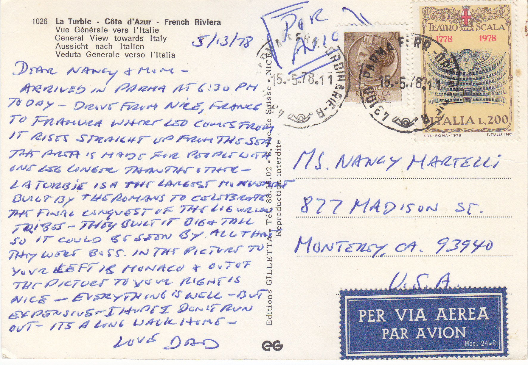 POSTCARD #222 La Turbie, Côte d'Azur, French Riviera, view towards Italy [Italy]. 1026. Editions Gilletta, Tel. 88.25.02. 8 Rue de Suisse, Nice [France]. Reproduction interdite. 6" x 4" EXC
