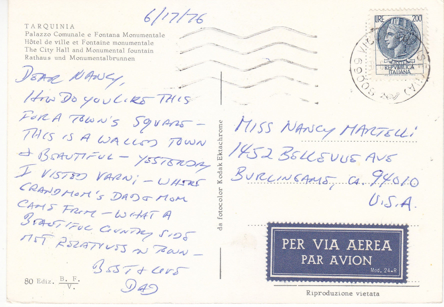 POSTCARD #223 City Hall and Monumental Fountain, Tarquinia [Italy]. 80. Ediz. B.F.V. Riproduzione vietata. Da fotocolor Kodak Ektachrome. 6" x 4" VG