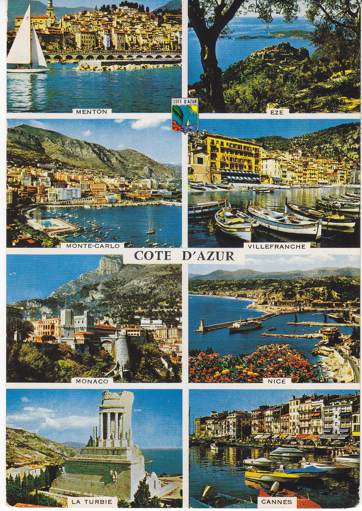 POSTCARD #224 Menton, Eze, Monte-Carlo, Villefranche, Monaco, Nice, La Turbie, Cannes. 090. The Wonderful landscapes of the French Riviera. Editions Gilletta. Tel. 88.25.02. 8 rue de Suisse, Nice [France]. Reproduction interdite. Imprimé en Italie. 6" x 4" VG