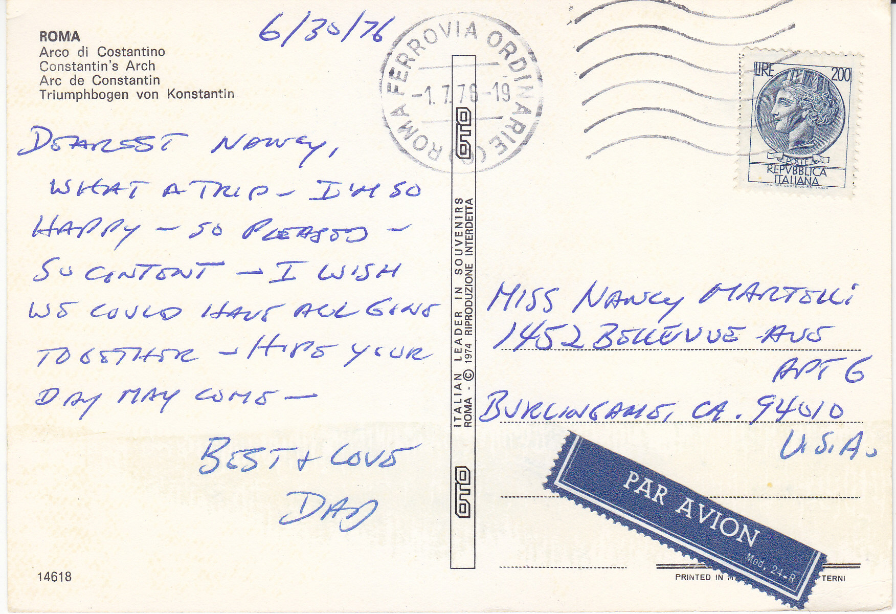 POSTCARD #225 Constantin's Arch, Roma [Rome, Italy]. 14618. OTO Italian Leader in Souvenirs. Roma. Copyright 1974 Riproduzione Interdetta. 6" x 4" VG