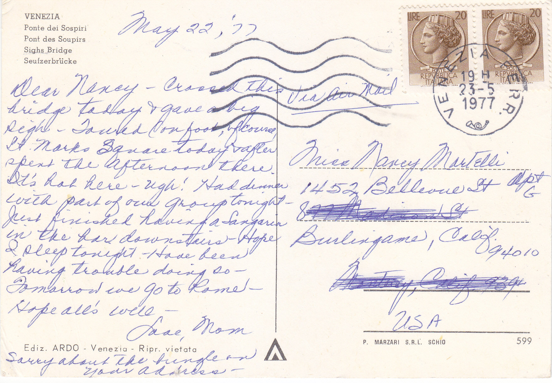POSTCARD #283 Bridge of Sighs, Venezia [Venice, Italy]. 599. Ediz. Ardo. Venezia. Ripr. vietata. P. Marzari S.R.L. Schio. 6" x 4" VG
