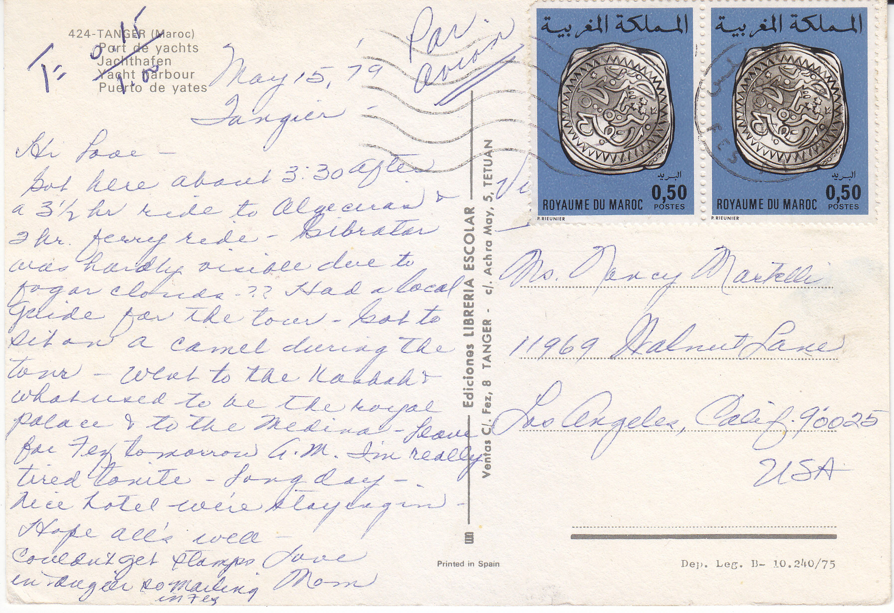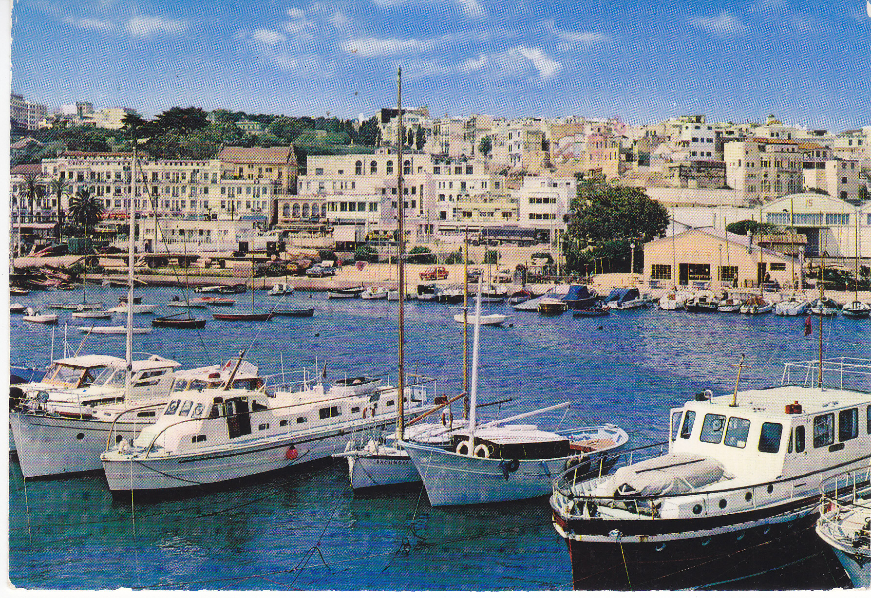 POSTCARD #288 Yacht Harbor, Tanger, Maroc [Tangier, Morocco]. 424. Ediciones LIbreria Escolar. Ventas C/. Fez, 8 Tanger c/. Achra May, 5 Tetuan. Printed in Spain. Dep. Leg. B-19,240/75. 6" x 4" GD