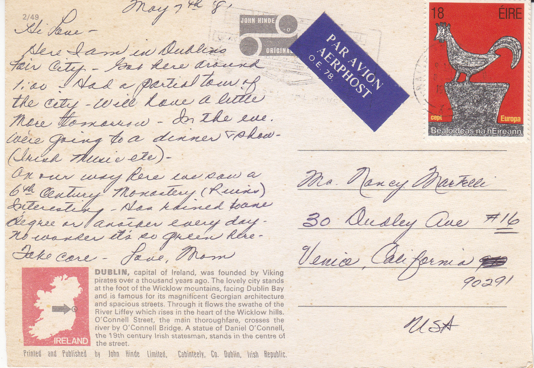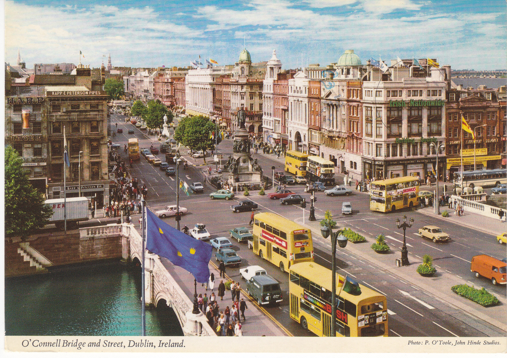 POSTCARD #293 O'Connell Bridge and Street, Dublin, Ireland. Photo P. O'Toole, John Hinde Studios. 2/49. Dublin, capital of Ireland, was founded by Viking pirates over a thousand years ago. The lovely city stands at the foot of the Wicklow mountains, facing Dublin Bay and is famous for its magnificent Georgian architecture and spacious streets. Through it flows the swathe of the River Liffey which rises in the heart of the Wicklow hills. O'Connell Street, the main thoroughfare, crosses the river by O'Connell Bridge. A statue of Daniel O'Connell, the 19th century Irish statesman, stands in the centre of the street. Printed and Published by John Hinde Limited, Cabinteely, Co. Dublin, Irish Republic. 6" x 4" EXC